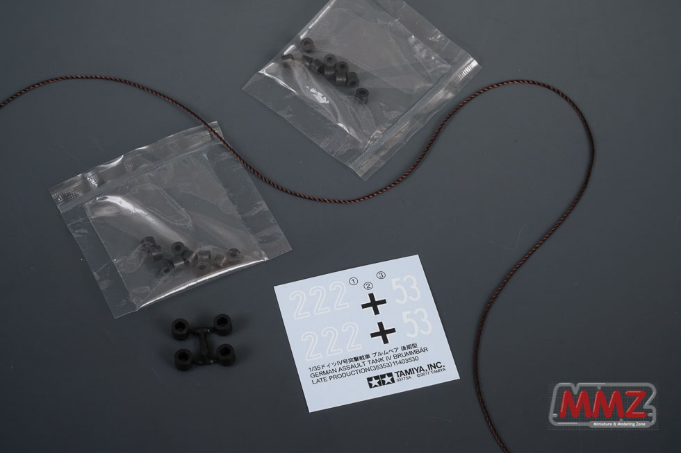 폴리캡, 나일론 토잉 케이블 그리고 데칼이 포함되어 있습니다. 토잉케이블을 검정색으로 한 것은 환영할만한 일입니다. 마킹은 45년 초 헝가리와 부다페스트에서 작전한 219돌격전차대대 등 2기분이 들어있습니다.
