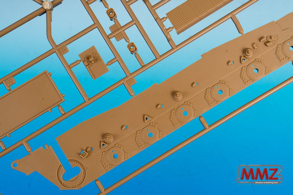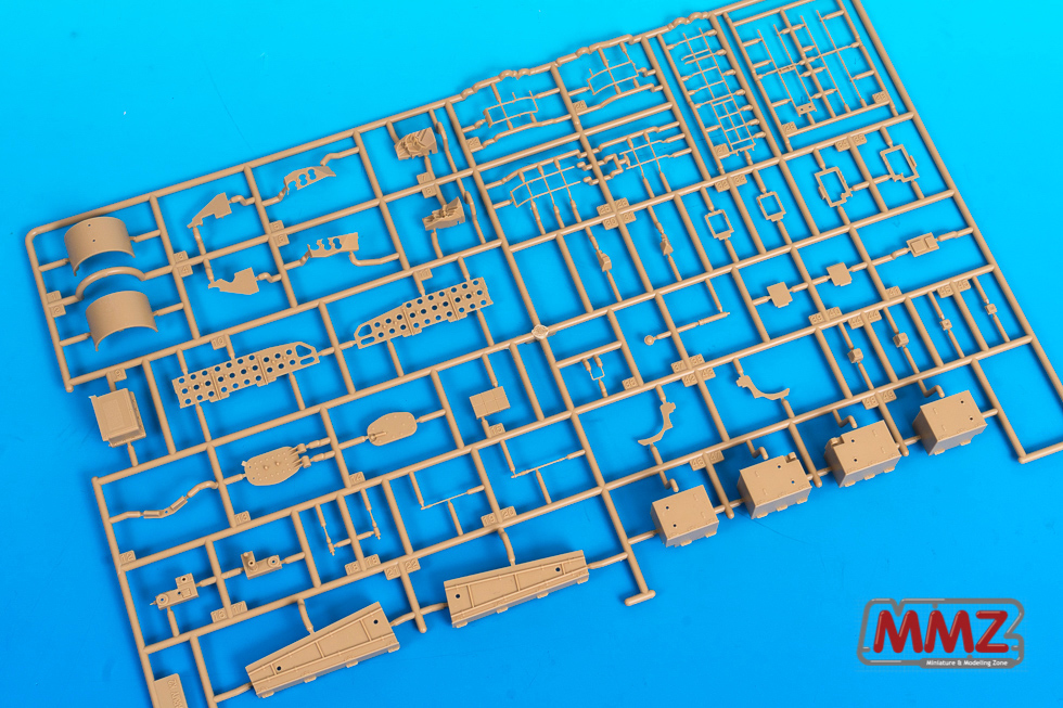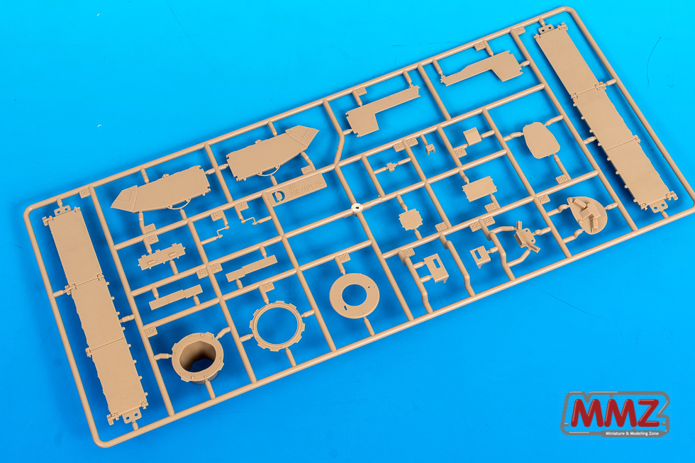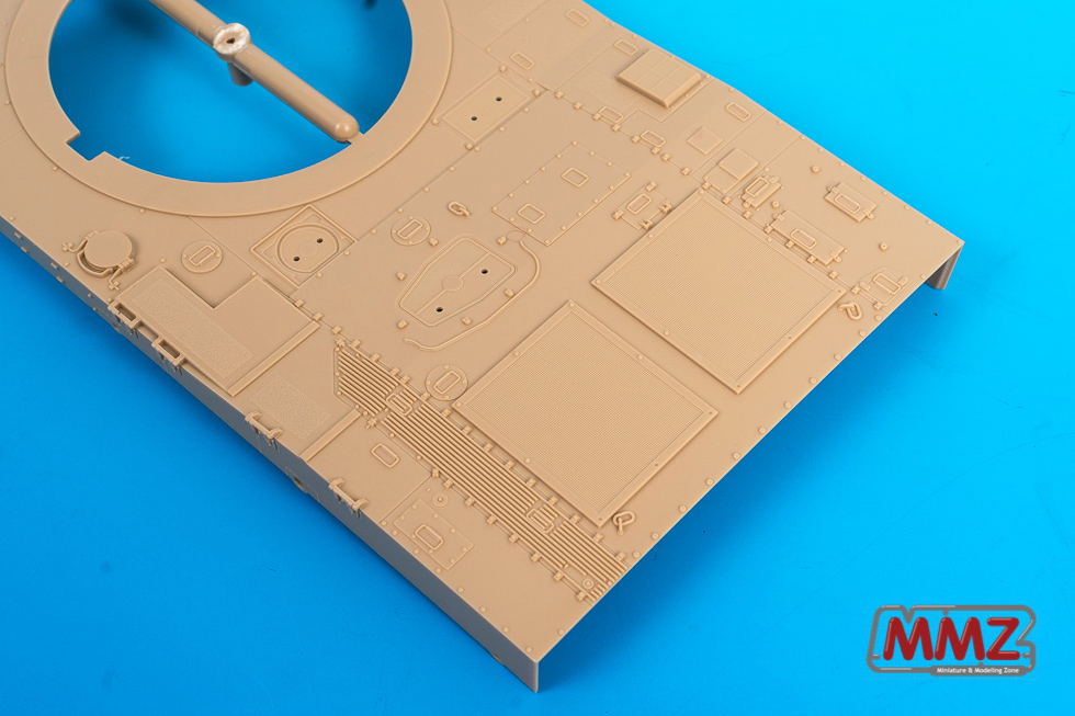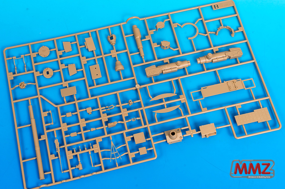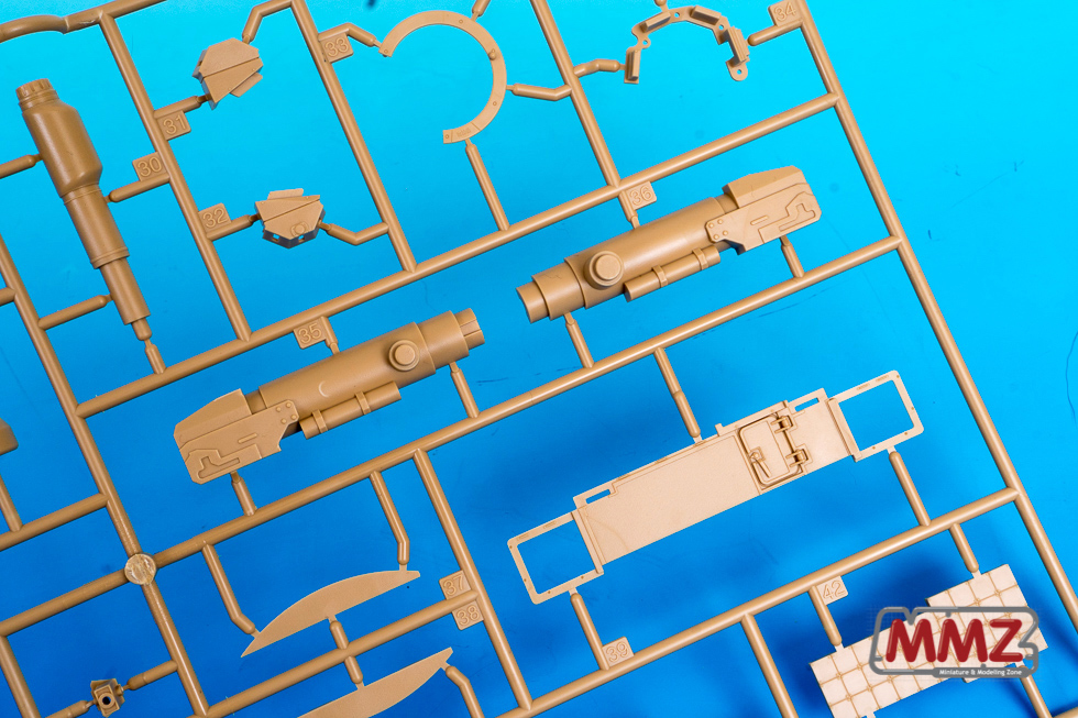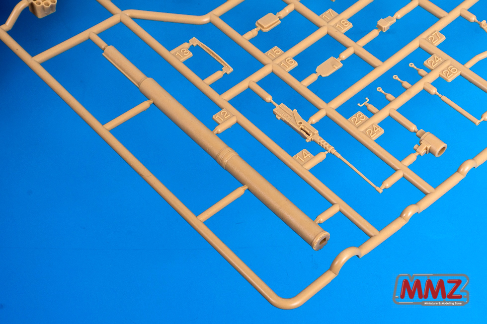 포신은 슬라이드 금형을 사용, 일체형으로 구성되었습니다. 그 밖에 기관총 총구와 같은 부분도 모두 슬라이드 금형을 써서 조립 편의성을 높였습니다.