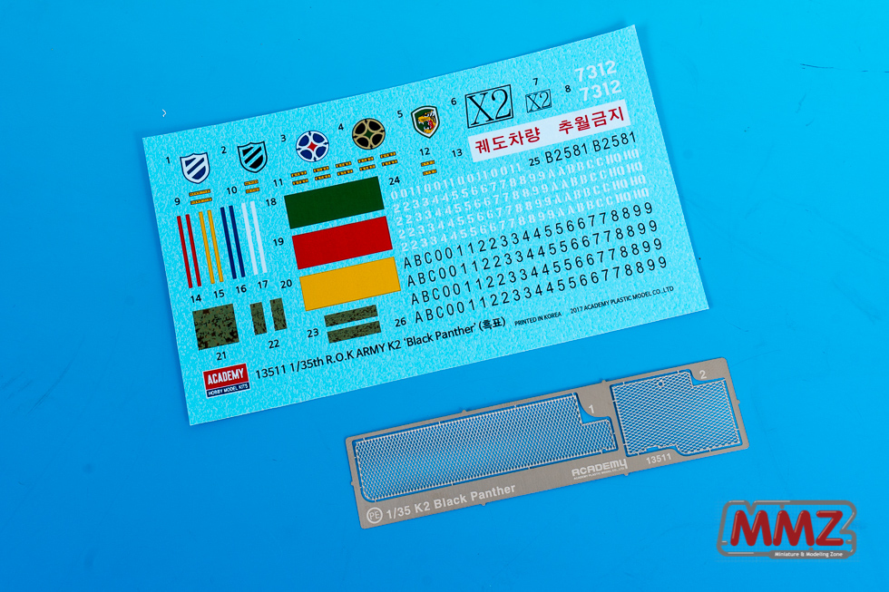데칼은 11사단, 20사단, 수도 기계화 보병사단의 세 가지 부대 마크가 포함됩니다. 수도 기계화 보병사단은 국산 파워팩 장착 차량의 보급이 예정되어 있습니다. 바스켓 에칭과 반사방지 필름이 포함됩니다. 반사방지 필름은 샘플에서 누락되어 촬영하지 못했으나 실 제품에는 포함됩니다.