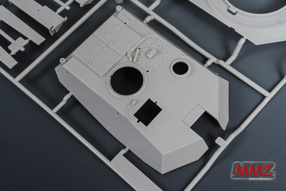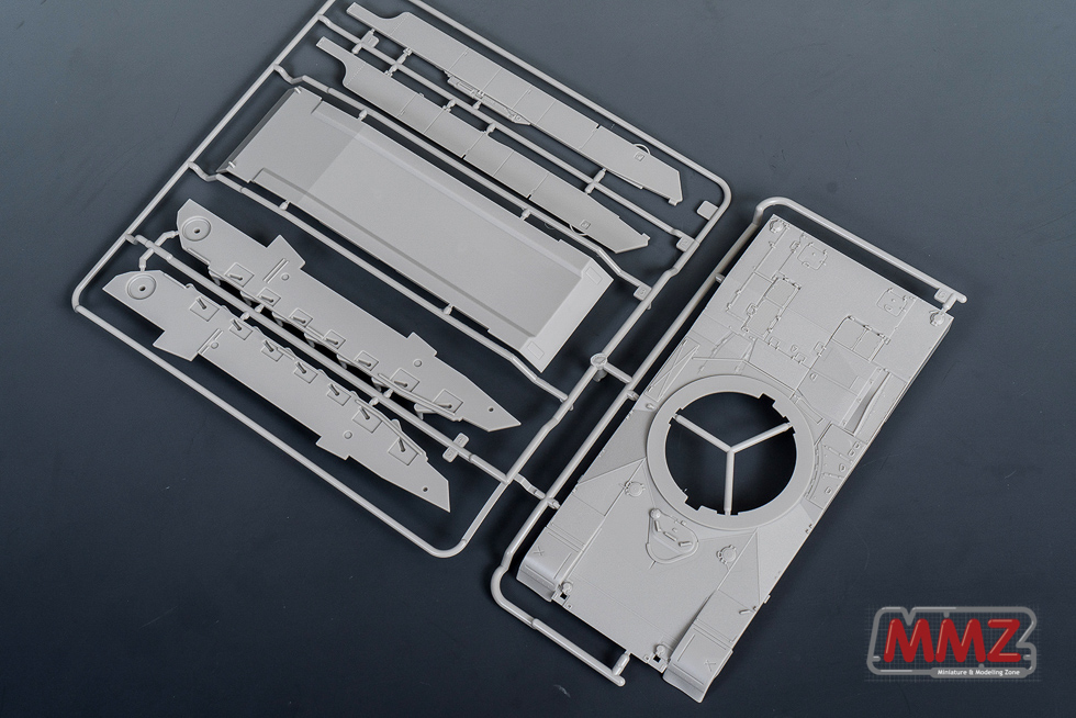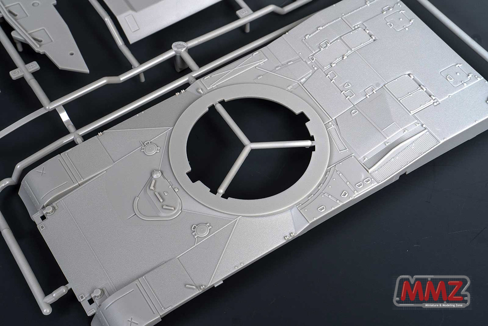 차체 상부에는 미끄럼 방지 코팅이 재현되어 있습니다. 운전병 해치가 차체에 몰드 되어 있는 것도 스케일을 생각하면 이해가능 한 부분이지만 솔직히 조금 아쉽습니다. 차체는 SEP버전이 아닌 기존 1/35 스케일 M1A2 OIF 키트와 동일한 사양으로 제작되어 있어 향후 M1A1으로의 바리에이션도 염두에 둔 것이 아닌가 생각됩니다.