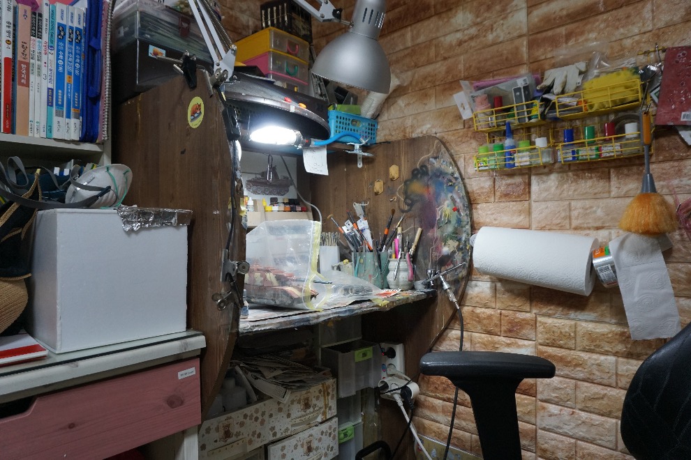 > 저는 작업실이 따로 없습니다. 방 한 쪽에 작은 칸막이 책상이 있는데 거기 위에 레인지 후드를 얹어 놓은 모양새입니다. 작업공간이 좁아 불편할 때도 많지만 모형 생활을 하는데 부족한 점은 없다고 생각합니다.