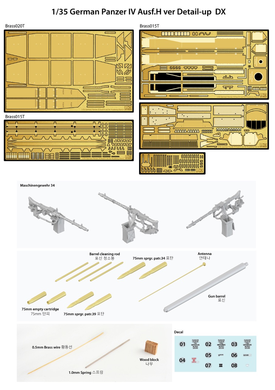 Dx는 4호전차용으로 기획된 대부분 부품을 포함합니다. 두께가 다른 황동의 에칭을 대량 채용하고 있으며, 고정밀의 레진 부품과 각종 황동 부품 및 알루미늄 포신, 포탄에 사용될 데칼 등으로 구성되어 있습니다.