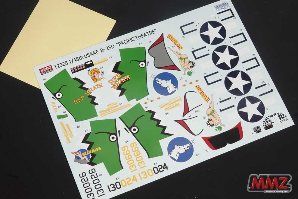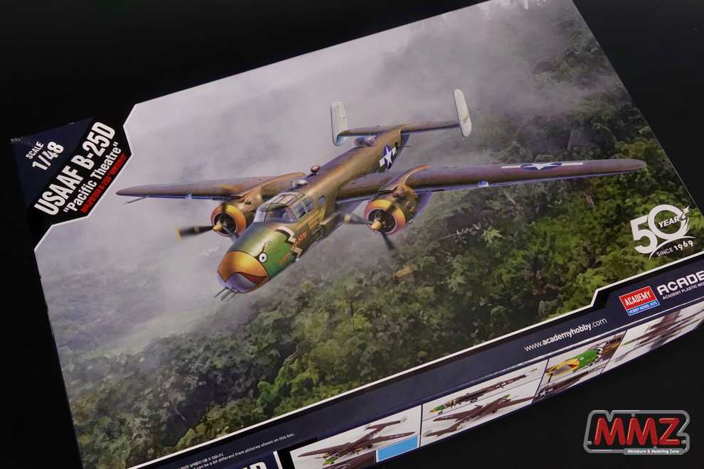 아카데미는 어큐리티 미니어처 금형의 1/48 스케일 B-25D를 재포장 발매합니다. 파츠는 변함이 없으며 아카데미가 디자인한 데칼이 카르토그라프제로 제공됩니다. 또한 설명서와 컬러 도색 가이드는 새로 만들어졌습니다.