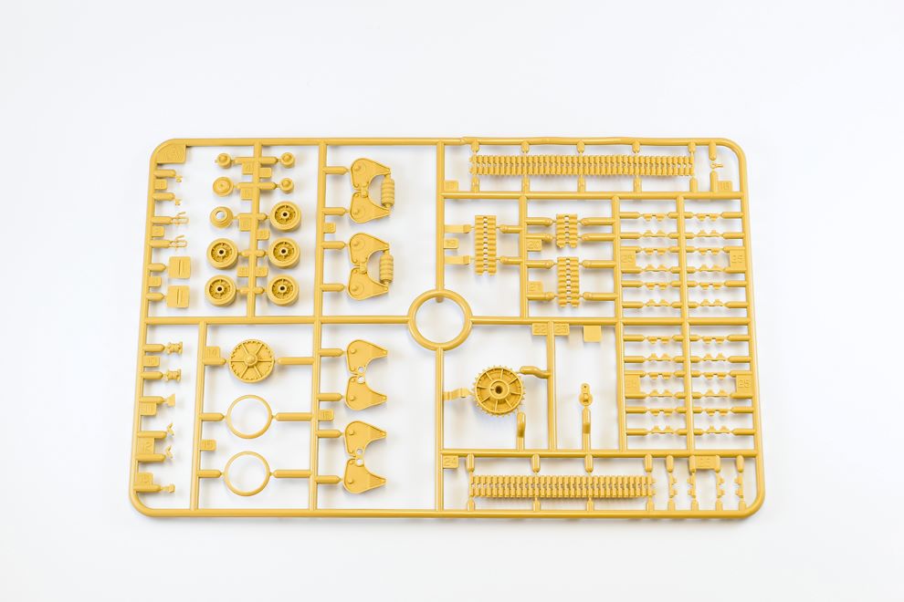 먼저 살펴본 A런너. 세미커넥팅 트랙과 서스펜션 부품으로 채워져 있으며 총 2벌이 들어있습니다. 개인적으로는 전체조립에 있어서 시간을 가장 많이 차지한 궤도부품들이지만 꽤 신경을 썼다는 느낌이 들 정도로 재현되어 있습니다.