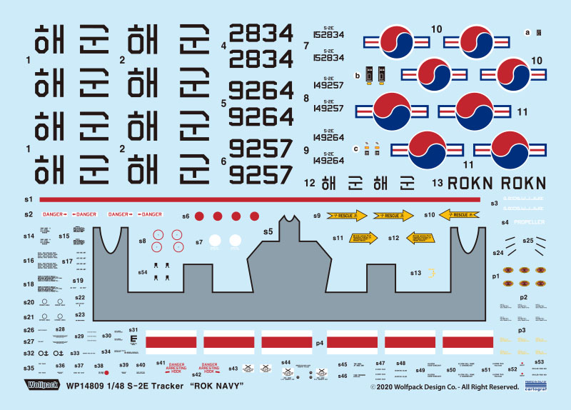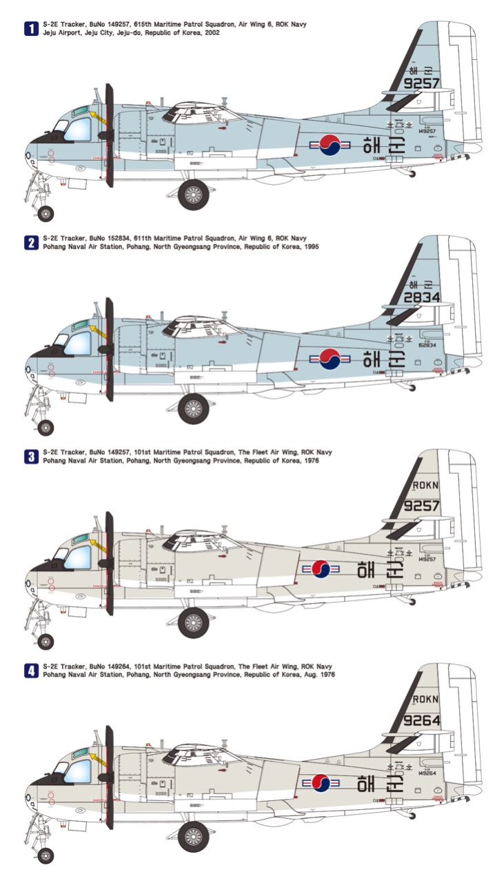 1976년 S-2E 후기형 트랙커 첫 도입 시 미국공장에서 오버홀을 거치고 재도색된 미군형 스텐실을 가진 기체와 1980년대 재도색 후 바뀐 국적마크와 '해군' 마크를 따로 재현하고 있습니다.70년대 새로 창단되었을 당시 해군 함대항공단(현재 6전단) 제101 비행대 마크 두 종과 90년대 제6전단으로 개편된 후의 제611 비행대와 615 비행대 마킹이 들어있습니다.