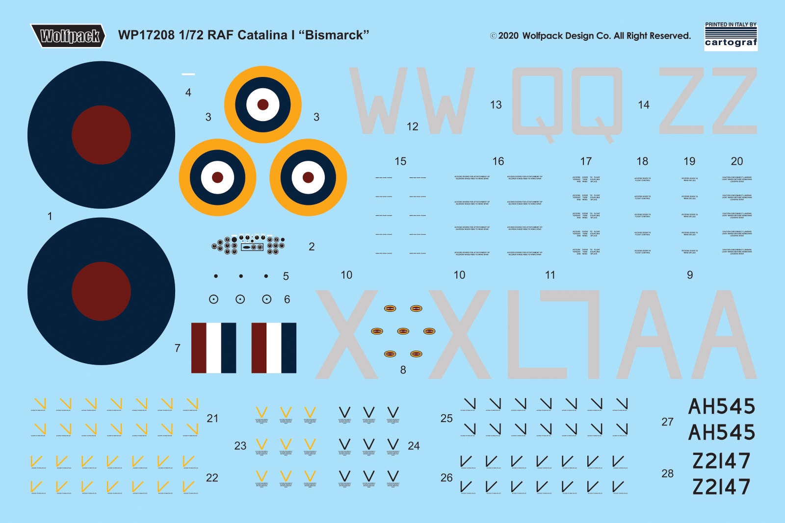 키트의 마킹은 비스마르크 추격전 당시 영국 공군으로 배속된 미 해군 조종사 레오나르드 B. 스미스가 조종하여 전함 비스마르크를 발견한 제209 비행대 소속기와 지브롤터 기지를 거점으로 지중해에서 U-보트 초계 및 사냥에 활약한 제202 비행대 소속기를 재현하고 있습니다. 데칼은 이탈리아 카르토그라프제로 국적마크와 스텐실 마크들도 영국공군 사용기에 맞춰져 세팅되어 있습니다.