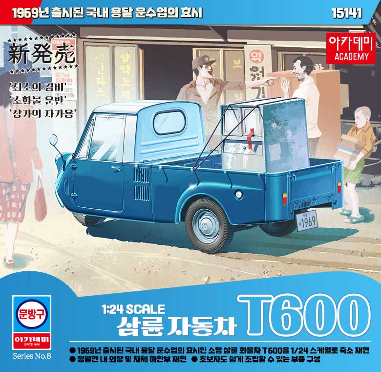 아카데미는 1/24 스케일의 기아 T600 삼륜차를 발매합니다. 이 제품은 우수한 품질로 호평을 받은 K360을 개발했던 KA Models 제품을 기반으로 국내용 좌핸들 부품을 추가하고 적재함이 더 길어진 T600 모델을 재현하고 있습니다.