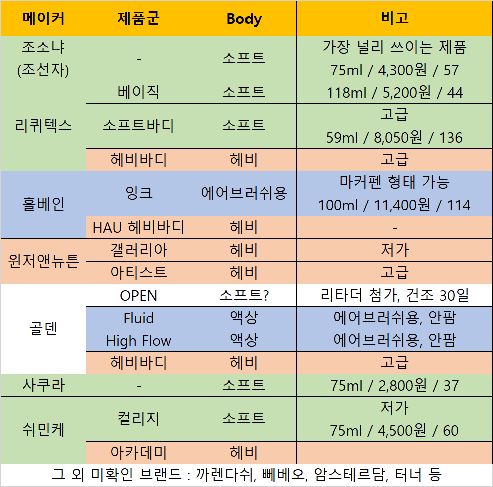 국내에서 판매하는 알파나 신한 모두 헤비 바디 타입 아크릴 물감만 판매하고 있으며,