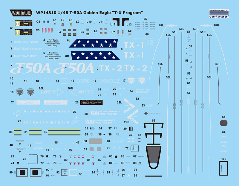 박스 안에는 아카데미 1/48 T-50 키트 두 대를 베이스로 34개의 레진 부품, 4개의 클리어 레진 부품, 4개의 선반가공 메탈부품, 2장의 에칭파트에 캐노피와 휠 마스킹 씰과 이탈리아 카르토그라프제 데칼이 포함되어 있습니다.