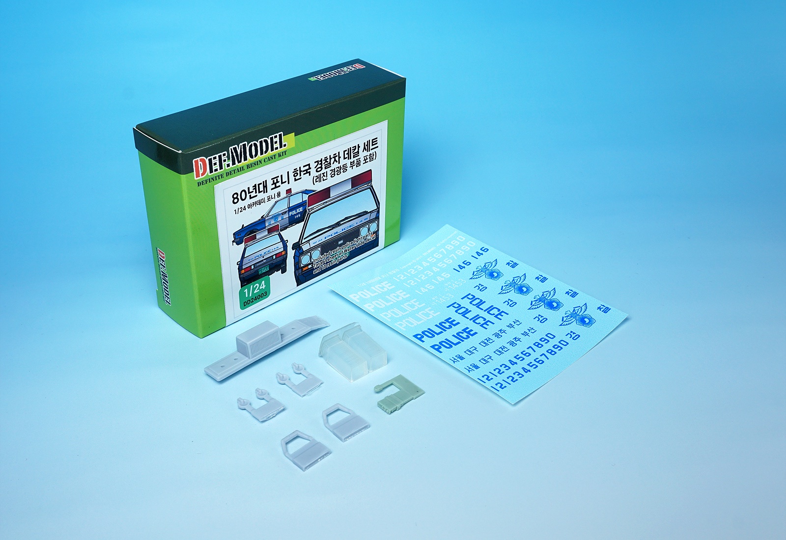 이 키트는 70-80년대 한국 경찰에서 사용한 포니 경찰차의 외형을 재현하는 키트로 그 당시 경찰차의 도장 패턴과 도안을 재현한 데칼과 부속 키트로 구성되어 있습니다.