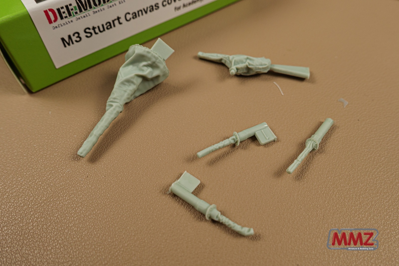 M3 스튜어트를 위한 캔바스 커버 세트는 M3스튜어트에 장착된 1개의 포신, 3개의 기관총에 캔바스 커버가 씌여진 모습을 재현하고 있습니다. 과거에는 일일히 에폭시등으로 만들어야 했던 부분을 이렇게 손쉽게 재현할 수 있게 되었습니다.