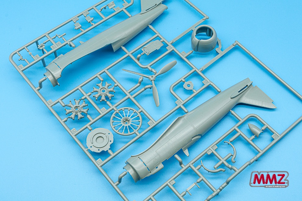 동체부품 사이에 다중 슬라이드 금형으로 일체로 재현된 엔진 카울링 부품이 시선을 잡습니다. 보통 좌우분할과 기관총구가 있는 상면을 따로 분할하는데 아카데미 제품은 한 부품으로 재현하고 있습니다.