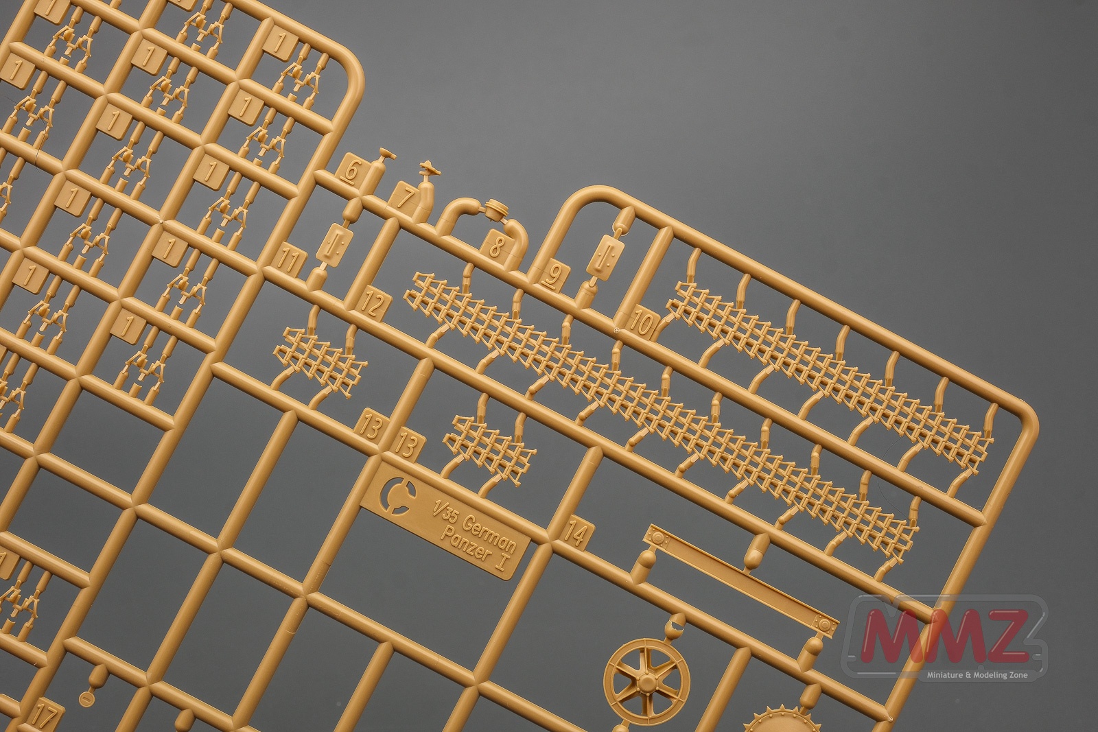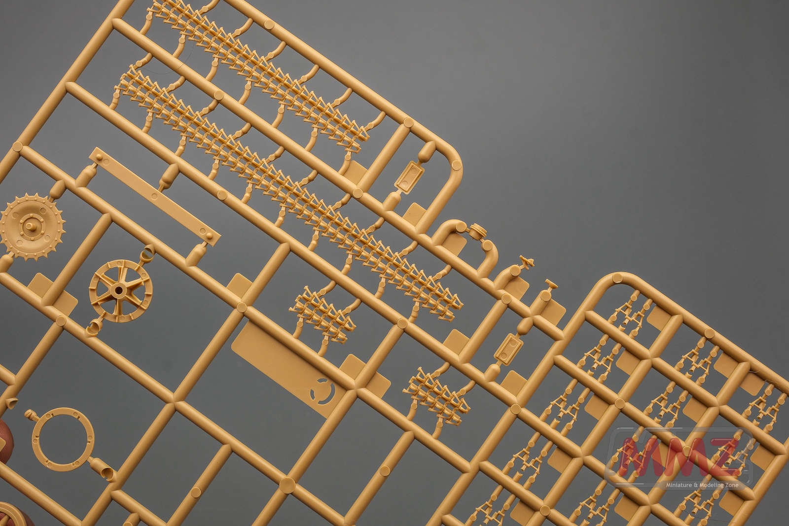 전차는 런너 네벌, 슬라이드 금형으로 사출된 포탐, 애칭, 데칼 그리고 나일론 견인 로프로 구성됩니다. 그 중에 A 런너는 주로 차체와 포탑 상부 부품으로 구성되어 있습니다.