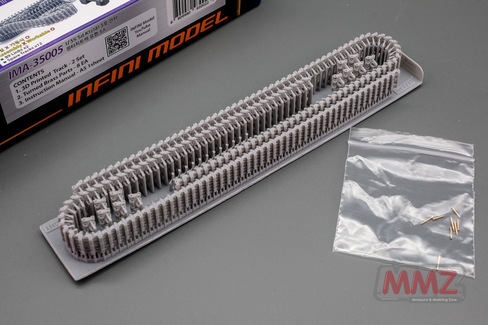 조립이 필요없는 완전 가동식 3D 프린팅 트랙을 발매하여 신선한 바람을 일으켰던 인피니 모델에서 후속작으로 3,4호 트랙을 발매합니다. 입수한 샘플은 초기형 트랙에 해당하는 38cm 트랙으로 3,4호용으로 각각 발매됩니다.