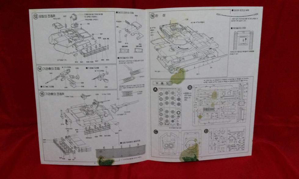 15. 설명서 : 본 제품은 처음 구득시부터 설명서가 없었습니다. 그래서 제가 옛날에 만들었던 m1 설명서 일부(찢겨져 나가 일부만 남아 있는 설명서)를 올려봅니다. 저기 국방색 페인트 얼룩은 당시 처음으로 사본 아카데미 에나맬 페인트를 적용했던 흔적이 남은 것입니다. 소년의 창작의 고통이 투영된 것으로 봐주시면 좋겠군요.