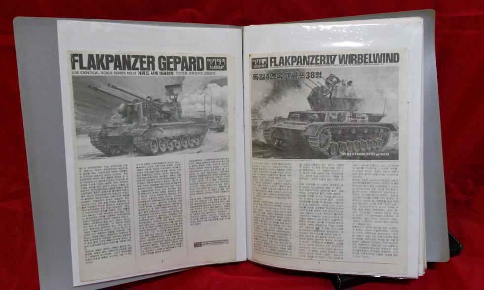 16. 자매품 설명서 : 80년대 제가 직접 구매하구 만들었던 게파드와 4연속 고사포 설명서 입니다. 80년대 물건이니 오래되구 빛바랜 것이지만 제 손때가 아직 남아 있어서 정감이 갑니다. 대공포를 좋아하게 된 계기는 탱크뿐만 아니라 비행기도 아주 좋아했었기 때문입니다. 그래서 천장에 매달아 놓은 프롭기 등과 아래의 대공전차들의 대전 연출은 모형의 재미를 배가시켜주었었죠.