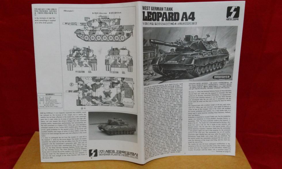 오늘 소개할 제품은 세미나과학의 레오파드(1) A4입니다. 당시로 볼 때 서독의 현용전차로서 대전물과는 사뭇 다른 맛이 배어납니다. 많은 분들이 만들어 보셨을 전차이구요 저같은 경우에는 80년대 아카데미제 1대와 90년대 초 세미나 모형용 1대를 구매해본 경험이 있습니다.