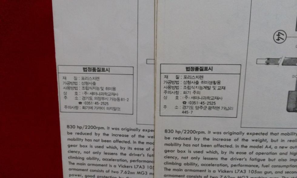 설명서 우측이 90년대 당시 제가 구매하였던 모형용이구 좌측이 이후 구득한 주행용 설명서 입니다. 주소가 양주군과 의정부시로 각각 다른데 이건 배경 스토리가 있는 것 같습니다. 뭔가 공장을 이전해간게 아닌가 하군요.