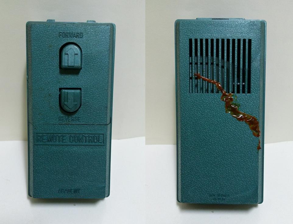 전후진용 리모콘입니다. 우측의 보기 좋지 않은 부분은 고무질이 녹아 달라 붙은 것입니다. 쉽게 제거가 되지 않을 것 같아 일단 그대로 둔 상태입니다.