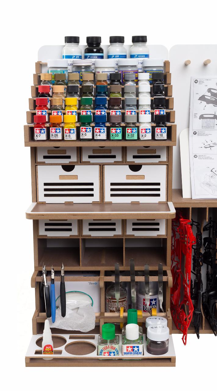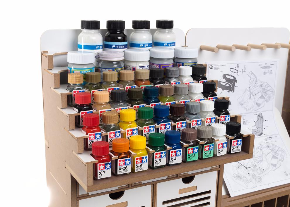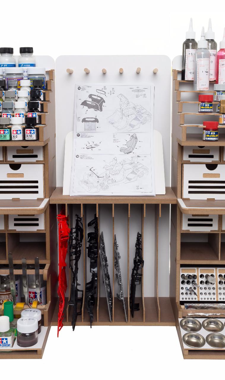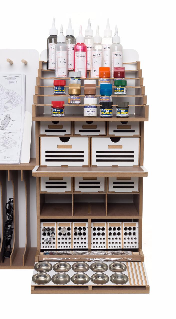 기존의 아티스테이션의 장점인 런너스탠드, 도료거치대, 핀셋걸이, 가로 꽃이, 설명서 거치대 등 여러가지 기능성 공간들은 최대한 살리는 대신 코너서랍, 코너도료장 그리고 스프레이부스 등을 없애서 최대한 사이즈를 줄이도록 설계 하였습니다.