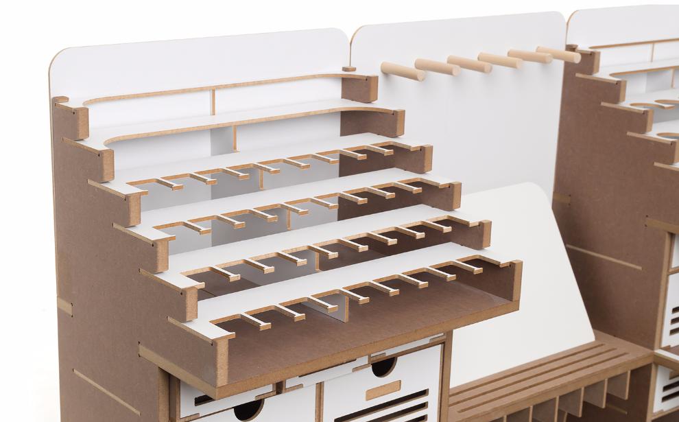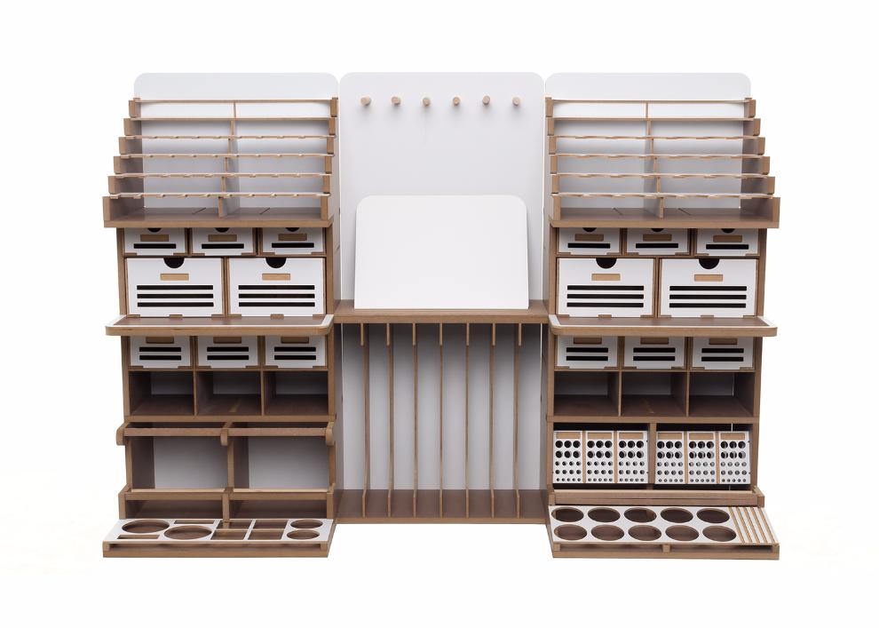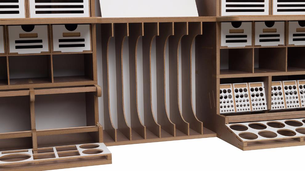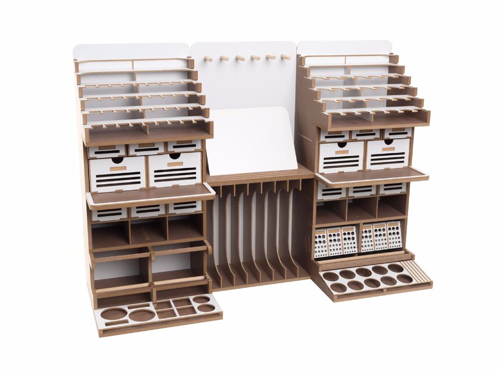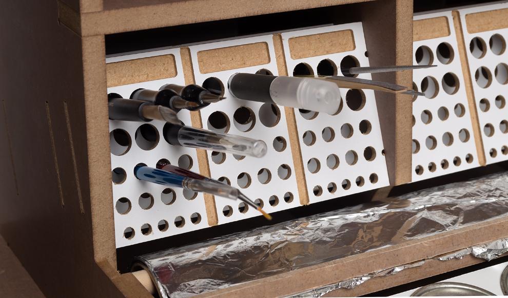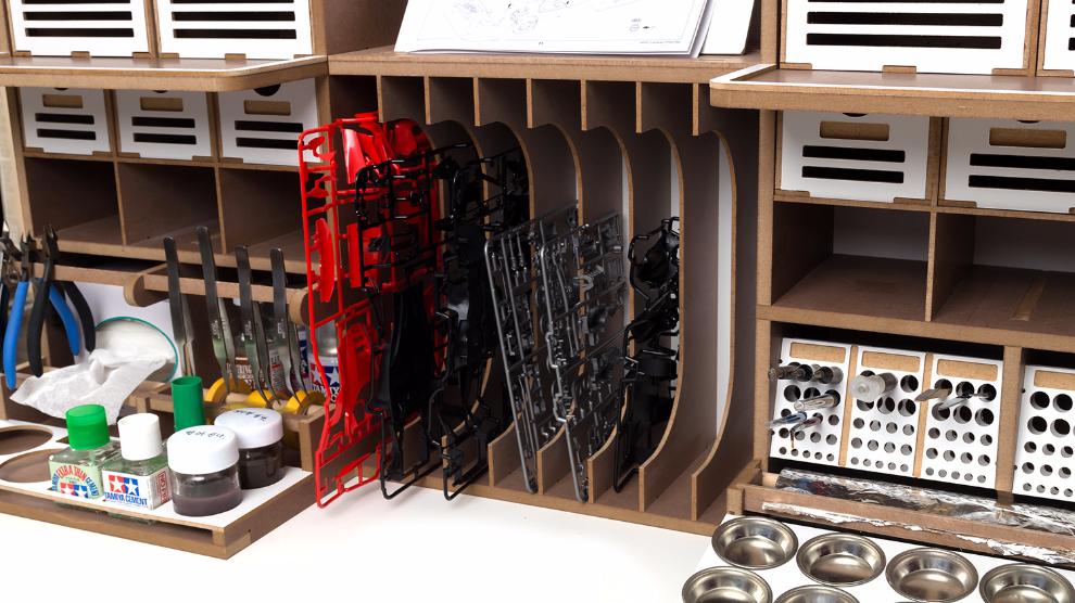 기존의 아티스테이션의 장점인 런너스탠드, 도료거치대, 핀셋걸이, 가로 꽃이, 설명서 거치대 등 여러가지 기능성 공간들은 최대한 살리는 대신 코너서랍, 코너도료장 그리고 스프레이부스 등을 없애서 최대한 사이즈를 줄이도록 설계 하였습니다.