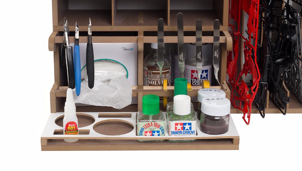 반대쪽 하단도 마찬가지로 각도를 준 핀셋걸이, 테이프류 거치대, 각종 접착제/신너 등 모형 잡자재 거치대가 동일하게 위치 합니다.