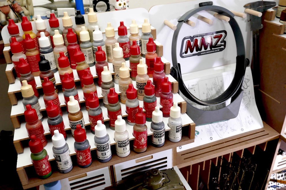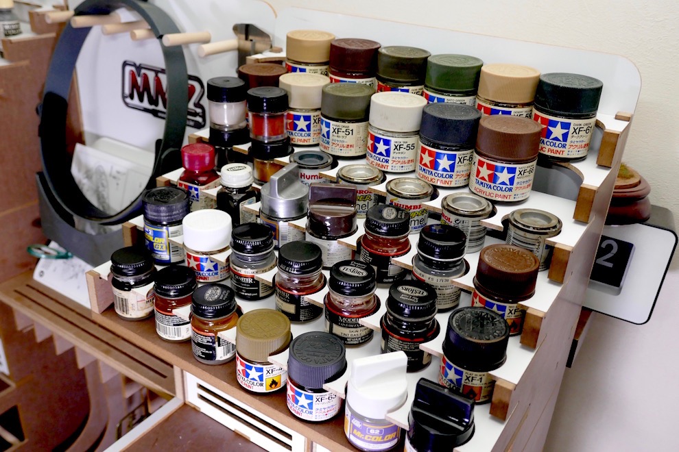아티스테이션 미니는 도료 수납 공간에 트레이를 분리할 수 있습니다. 전 타미야 에나멜은 거의 쓰지 않아서 타미야용 트레이는 빼 버리고 아크릴용 트레이를 부착하였습니다. 가지고 있는 아크릴 도료를 모두 수납할 수는 없었는데 뒤편에 일렬로 세워 놓으니 딱 정리가 되네요.