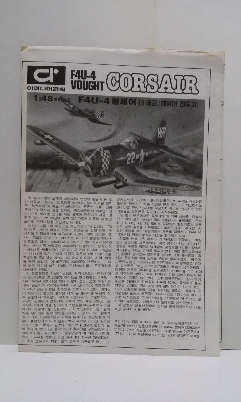 원래 프롭기는 취향이 아니었습니다. 제트전투기 1/72 스케일을 몇번 구입하다 크기가 작아서 큰 사이즈로 넘어가는 중 콜세어에 호기심이 생겨서 접해보게 되었죠. 구식의 프롭기임에도 콜세어를 구입한 이유는 단 하나입니다. 많은 분들이 공감하시듯 바로 '갈매기 날개'때문이죠. 개성있는 스타일의 날개에 필받아 아이디어제를 구입해보곤 아주 흡족해 했던 기억이 있습니다.