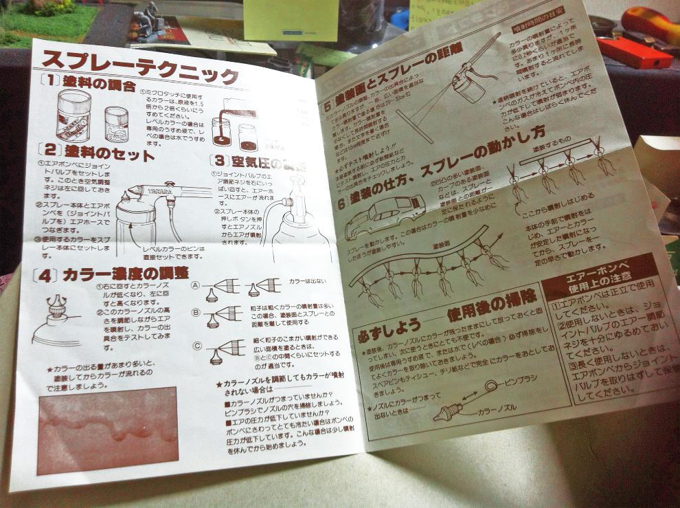 그냥 대충 볼줄아는 일어실력으로 설명서를 본 결과 주목 할 것은 도료를 분사하는 방식인데 브러쉬버튼을 누르면 동시에 도료병 안으로도 동시에 공기압이 전해져도료병위로 나있는칼라 노즐로 도료가 솟아나오고 이 도료를 브러쉬에서 나오는 바람으로 목표 방향으로 분사하는 방식입니다!