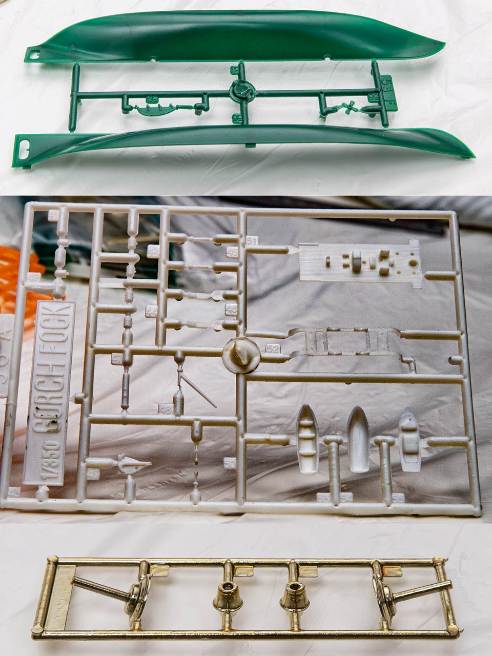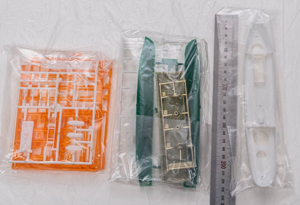 키트 퀄리티는 첫인상은 매우 안 좋았습니다. 워터라인 밑의 헐은 다듬는 작업이 필수로 보이고, 부품 중 일부는 검은 기름인지 이형제인지가 잔뜩 묻어 있어서 작업 시작 전에 세척이 필수입니다. (하얀색 부품 사진은 좀 과장된 상태입니다) 그리고 맥기를 먹인 부품도 상태가 매우 안 좋아서 그냥 신나탕으로 벗기고 새로 먹이는게 나아 보입니다.