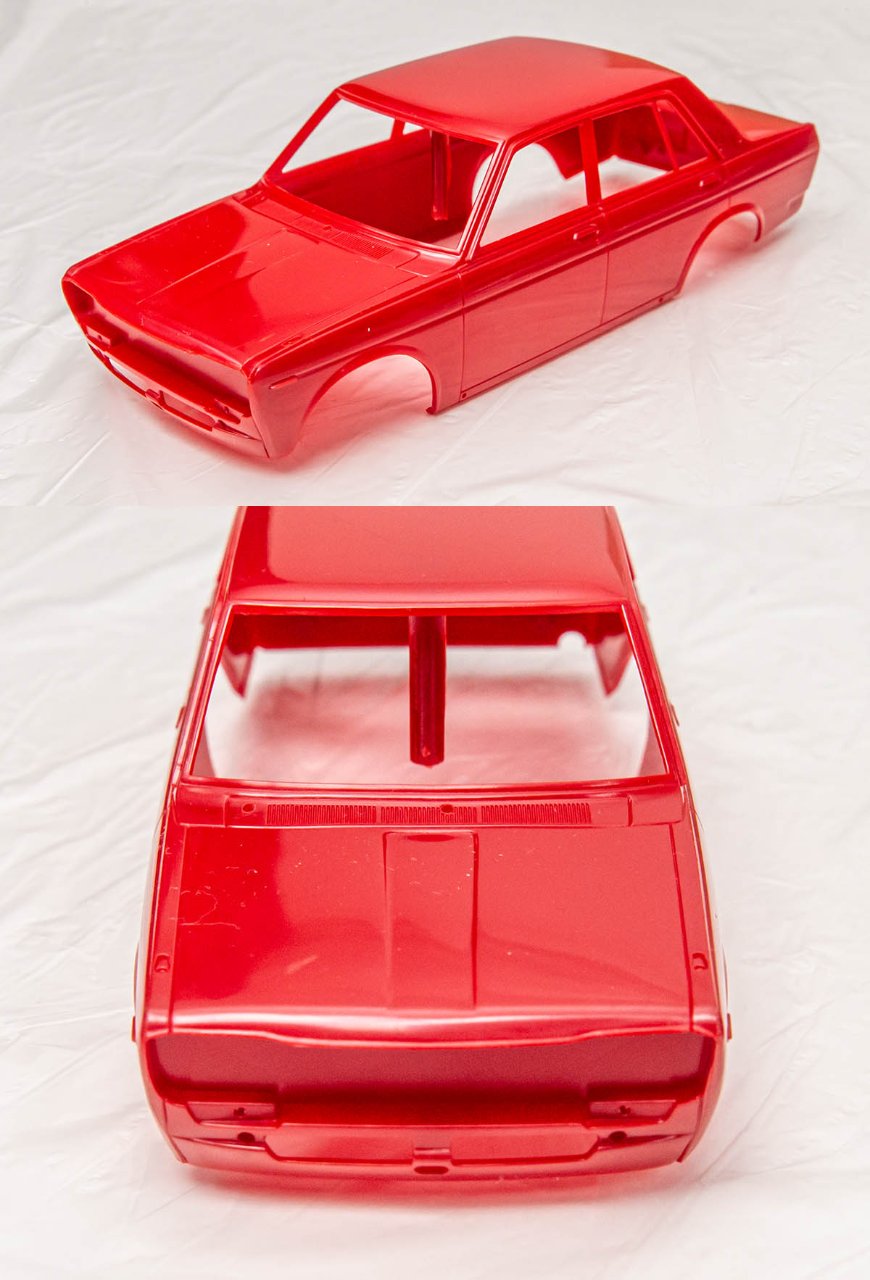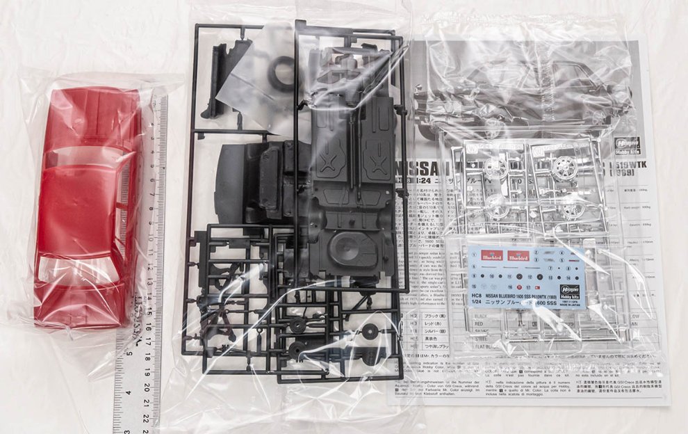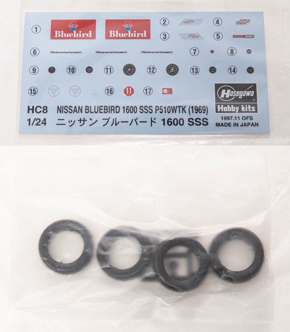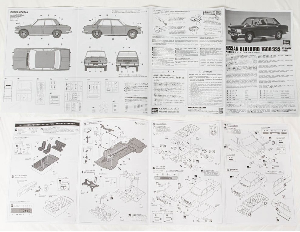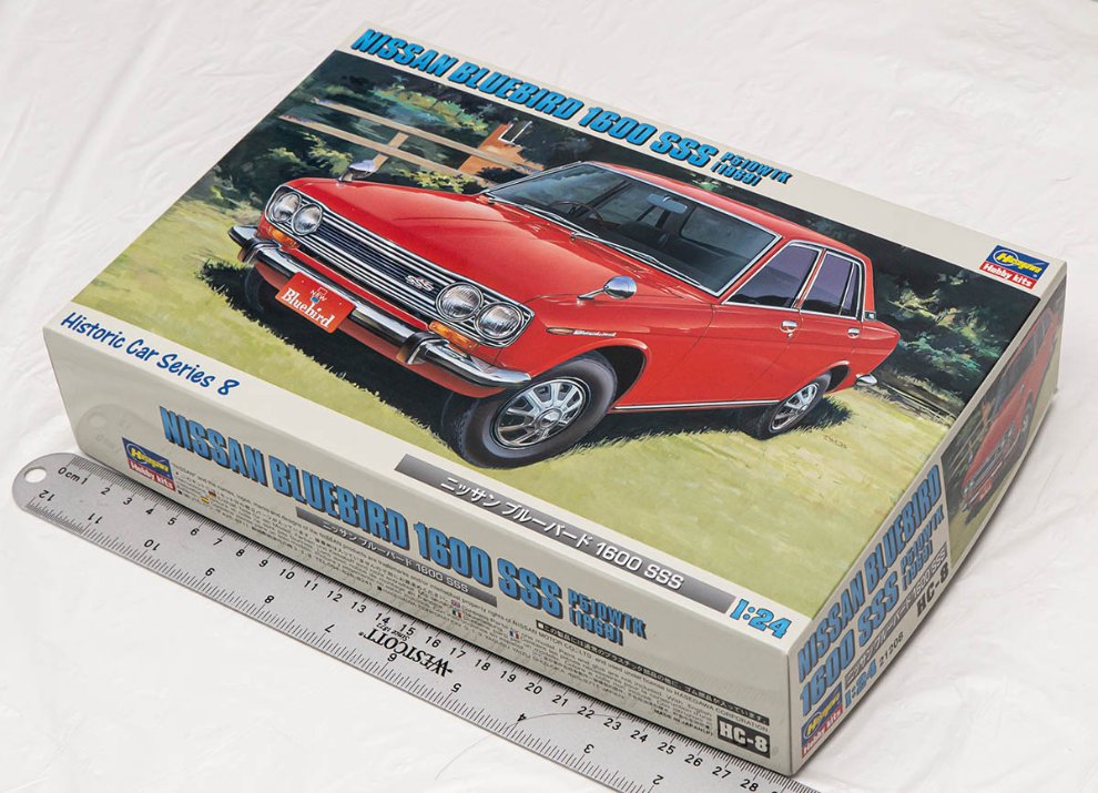 1997년에 하세가와에서 출시한 Nissan Bluebird 1600 SSS P510WTK (1969) 입니다. https://www.scalemates.com/kits/hasegawa-21208-nissan-bluebird-1600-ss-1969--186963 현재도 일마존 등에서 쉽게 구할 수 있으며, 하세가와에서 금형 그대로에 데칼을 바꿔가며 최신 제품으로 자주 출시중이라 구하기는 쉽습니다.