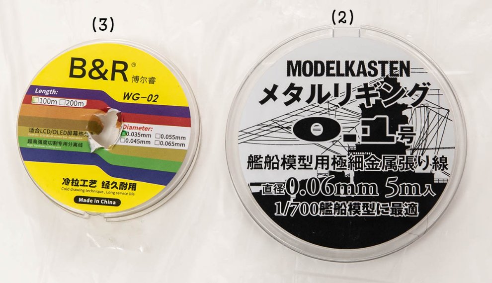 이 몰리브데넘 LCD 커팅 와이어는 총 4가지 규격으로, 0.035, 0.045, 0.055, 0.065mm 제품을 구할 수 있으며, 100미터로도 어지간한 함선 만들기에 충분한데 가격도 워낙 싸서 좋은 녀석입니다. 게다가 물성도 좋아서 모델카스텐의 메탈 와이어 0.060mm 나 한정판으로 나왔던 더 얇은 것들의 역할을 상당부분 대체할 수 있으리라 봅니다.