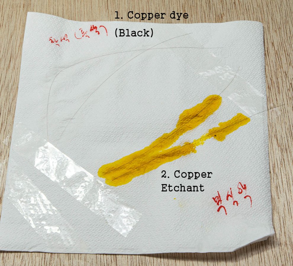 몰리브데넘 부식액은 그냥 동 부식액 화방에서 파는 검은 액체 쓰시면 됩니다. 1. 동 착색제는 효과 전혀 없더라구요.