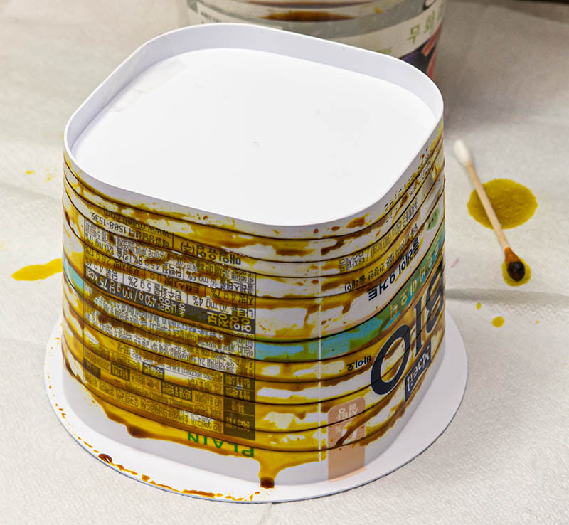 한꺼번에 전부 부식시키면 화학반응을 일으킬까봐 무섭고, 선 하나하나 물로 씻어야 하기 때문에 발열에도 유리하게 널럴하게 감아서 부식시킨 후 흐르는 물로 씻어냈습니다. 부식 시간은 거의 순간적이라 몇 초 정도로도 충분합니다만, 저렇게 길게 바르면 몇 분 정도 걸리는데 이래도 선의 강도는 유지됩니다. (부분적으로 잘 끊어지는 경우가 발생할 수도 있으니 지나치게 오래하면 안됩니다.) 감는 도구는 콜라 1.5리터 페트병 같은 게 좋을 것 같네요. 100미터나 되니 전부 부식시키려면 몇 번 작업해야 합니다.
