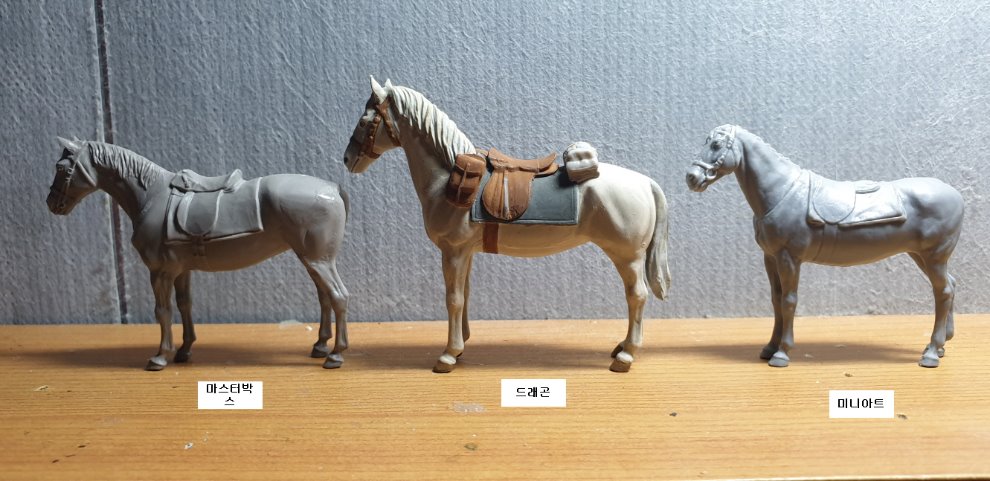 사진에는 드래곤과 마스터박스의 말만 나왔고, 미니아트의 말은 마스터박스의 것과 크기가 똑같고 색칠을 완료하지는 않아서 제외했습니다.