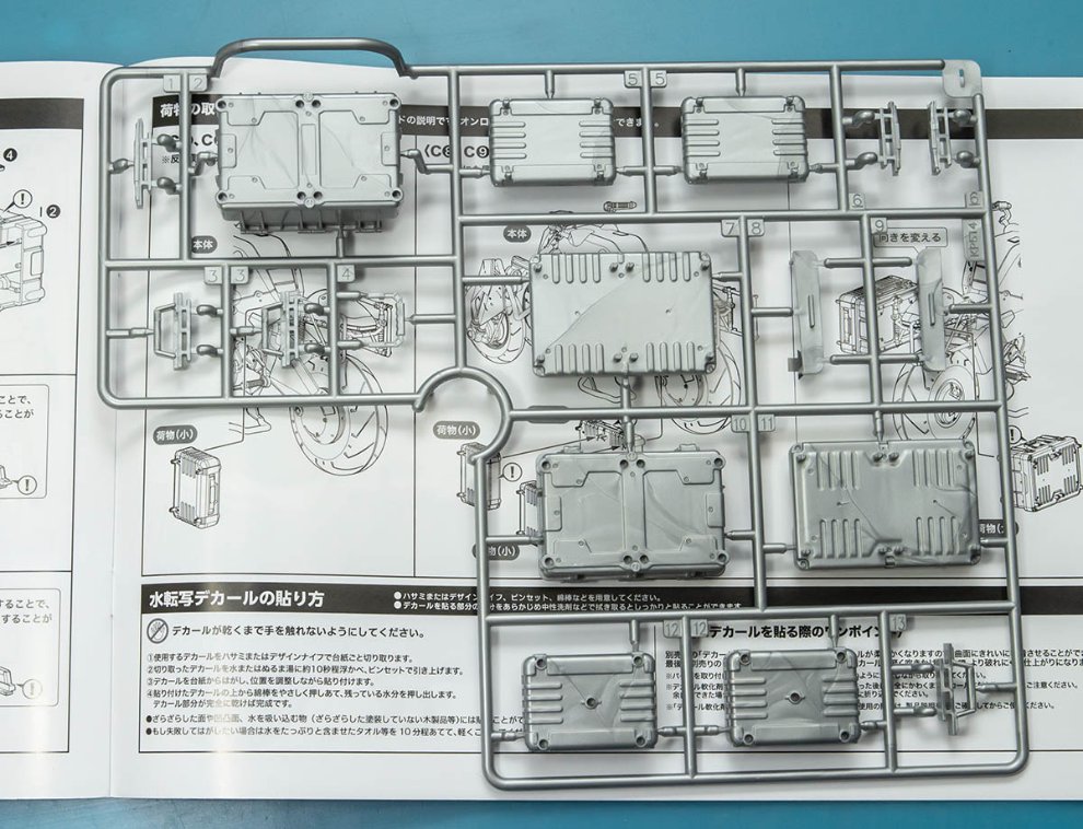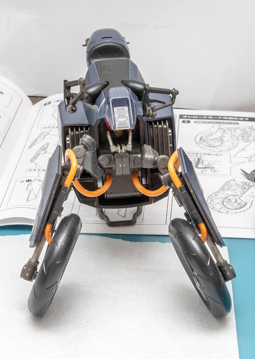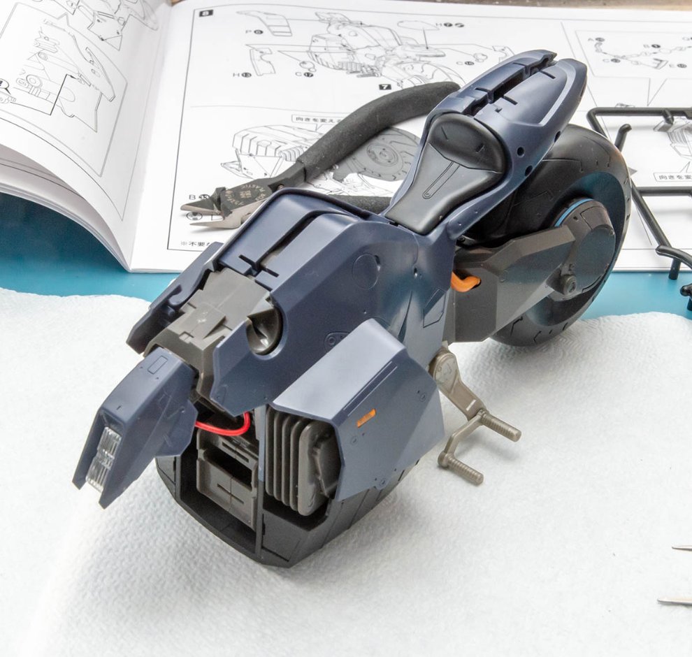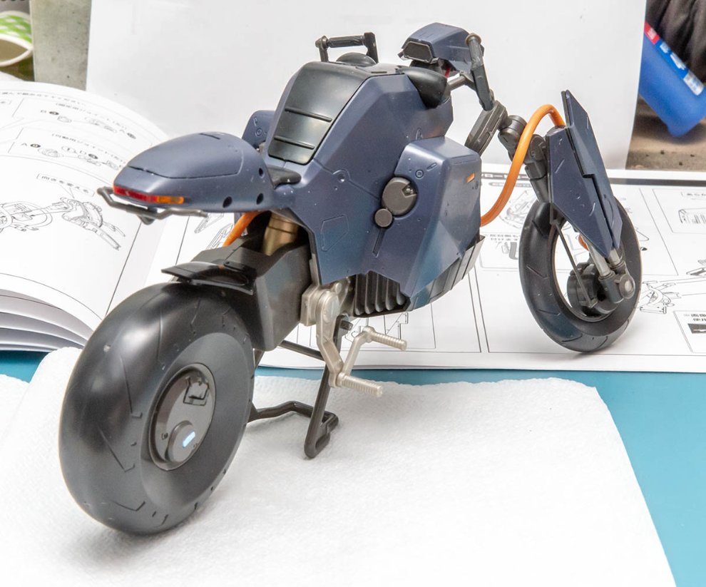 조립시에도 편의도가 높고 튼튼한데, 현실 오토바이 모형은 아주 얇은 철판부품 때문에 내구도가 떨어지는 경우가 있는 반면, 이 제품은 가상의 오토바이라 모든 부품이 두껍고 아주 튼튼하게 해놔서 가변시 잘 버티게 해놓았기 때문입니다. 덕분에 가조립 후 완전 분해해도 고생할 일 전혀 없습니다. 위에서 설명한대로 금형도 아귀가 굉장히 잘 맞고 배려를 잘 해둔 조립 스타일입니다.