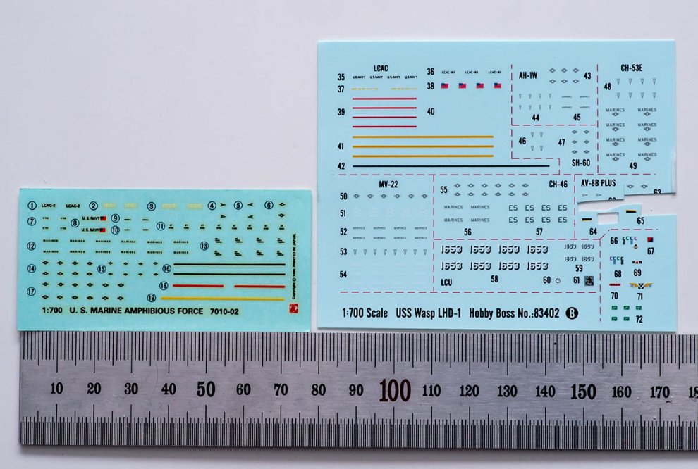 하비보스에서 나오는 1/700 Wasp class 킷은 심각한 오류가 산적해 있습니다. 1/350 Wasp class 를 축소해서 설계하다가 일부 부품을 1/350 그대로 내버려두고 사출하거나, 데칼을 1/350 사이즈로 출력해버린 겁니다. 위 사진 보면 아시겠지만 30년 전 드래곤 데칼은 엄청 작고 조밀한데 하비보스 데칼은 또렷하게 잘 보이죠? 비행기 위에 붙이면 데칼이 비행기를 뒤덮습니다 크흐흐흐흐 제가 웃고 있는게 아닙니다.