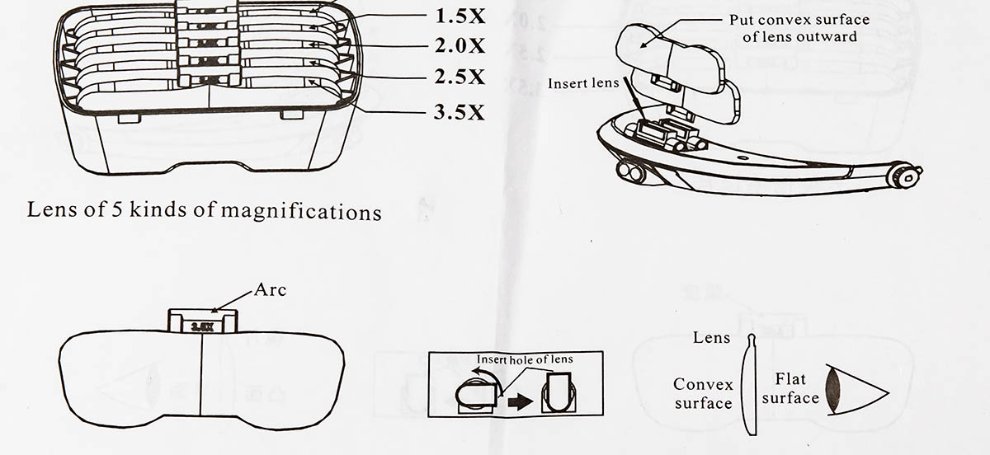돋보기 렌즈는 위와 같이 5종이 준비되어 있습니다. 1.0 배율도 곡면이 살짝 보이는데 보통 시력보다 확대되어 보입니다. 싸구려 플라스틱 렌즈라서 기스가 매우 잘 나므로 관리를 잘 해야 하지만, 이거 가격 1만원입니다.