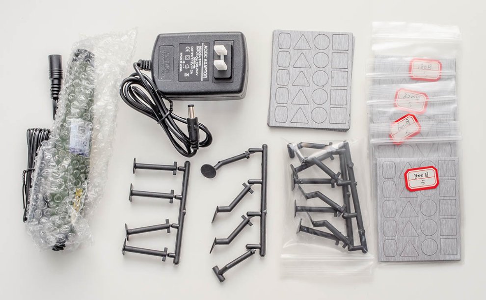 기본 구성품은 비트 8종류에 사포 스티커 4종류 1개씩이며, 저는 추가 비트 및 사포 종류별 5매씩을 별매로 구입했습니다. 전원은 프리볼트인데 110V 라서 220V 로 바꿔주는 돼지코를 사셔야 합니다.