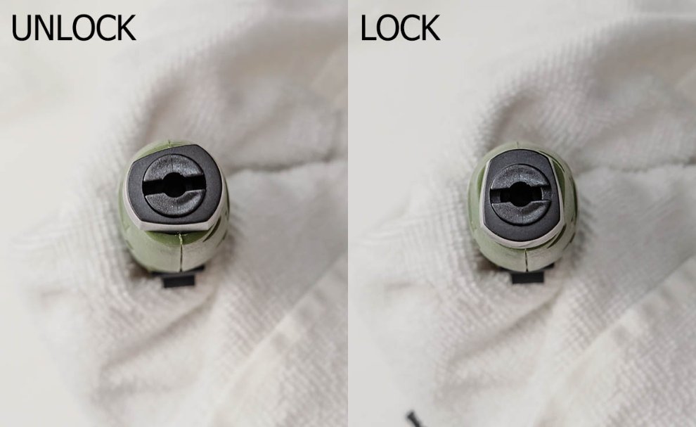 잠금과 열림은 이렇게 90도로만 작동하며 다른 쪽으로는 회전하지 않으므로 좀 갸우뚱합니다. 모양을 봐선 거꾸로 껴야 할 것 같은데 말이죠. 사용시 편의를 위해 잠금과 열림 위치를 화이트 등으로 마킹해두시기 바랍니다.