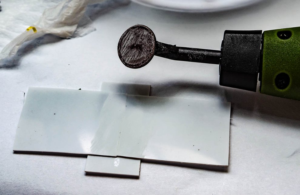 프라판 두개를 접합시키면서 만들어낸 자국을 지우는 테스트를 해봤습니다. 무수지 접착제로 두 프라판을 바짝 압착하면서 접착했기에 사이에 녹은 플라스틱이 올라오면서 울퉁불퉁해지는데, 그대로 도색하면 망합니다. 그래서 보통은 접착선을 따라 퍼티를 바르고 샌딩해서 매끄럽게 만들죠.