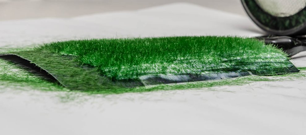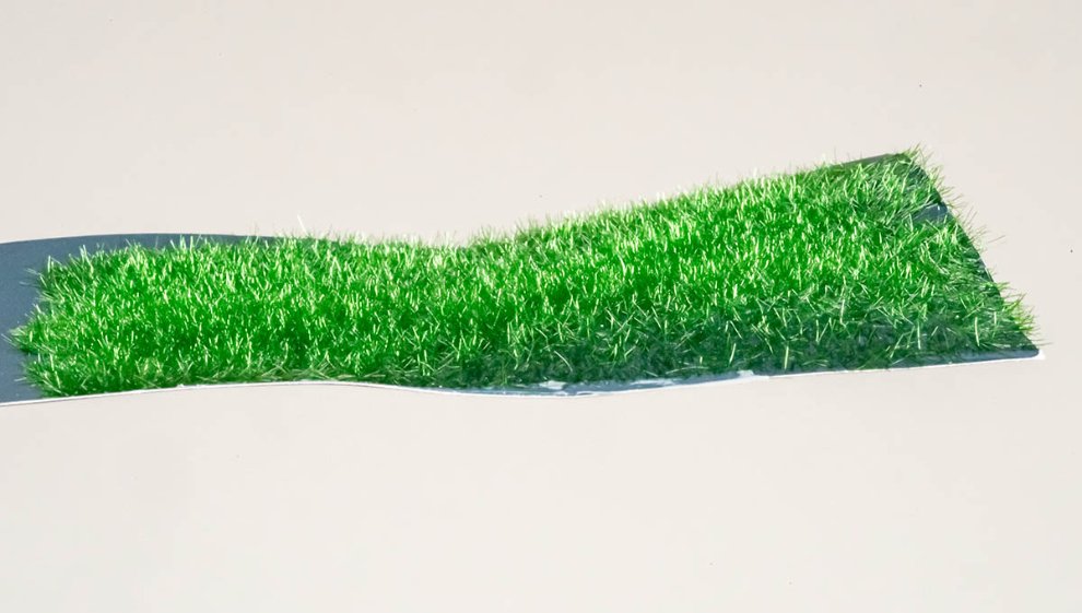 아직 마르지 않아서 하얀 목공용 본드가 그대로 보입니다. 그래도 잔디가 본드 위에 똑바로 선게 잘 보이죠? 그 옆 본드가 없는 곳에는 떨어진 잔디가 볼품없이 드러누운 것도 보입니다.