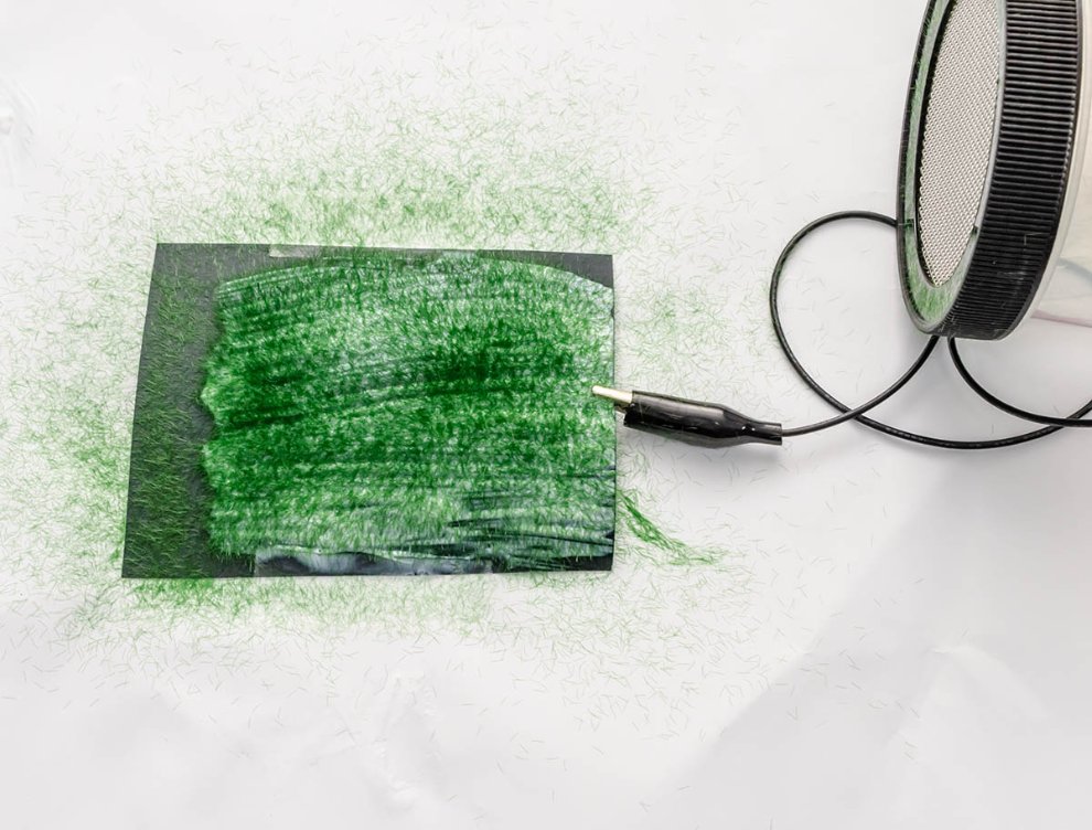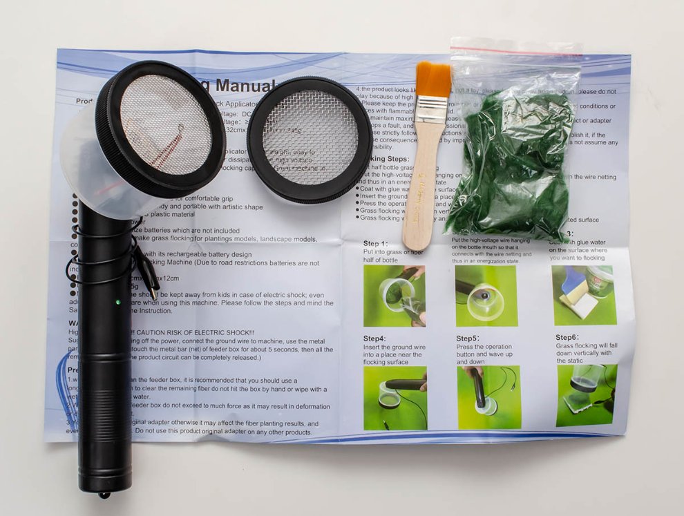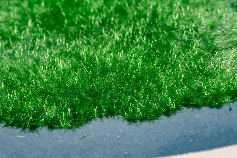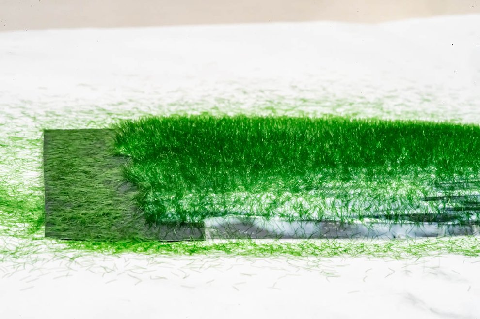 원리는 정전기를 이용하는데, 위에서 떨어지는 잔디 부스러기와 아래에서 받아주는 물풀에 전하를 걸어 잔디가 흐트러지지 않고 꼿꼿하게 땅으로 떨어지게 만드는 것입니다. 그냥 체로 탈탈 털어서 중력으로 잔디를 세우는 방식이 절대로 아닙니다. 그래서 복잡한 디오라마 지형 어디든지 마음껏 적용할 수 있게 되죠.