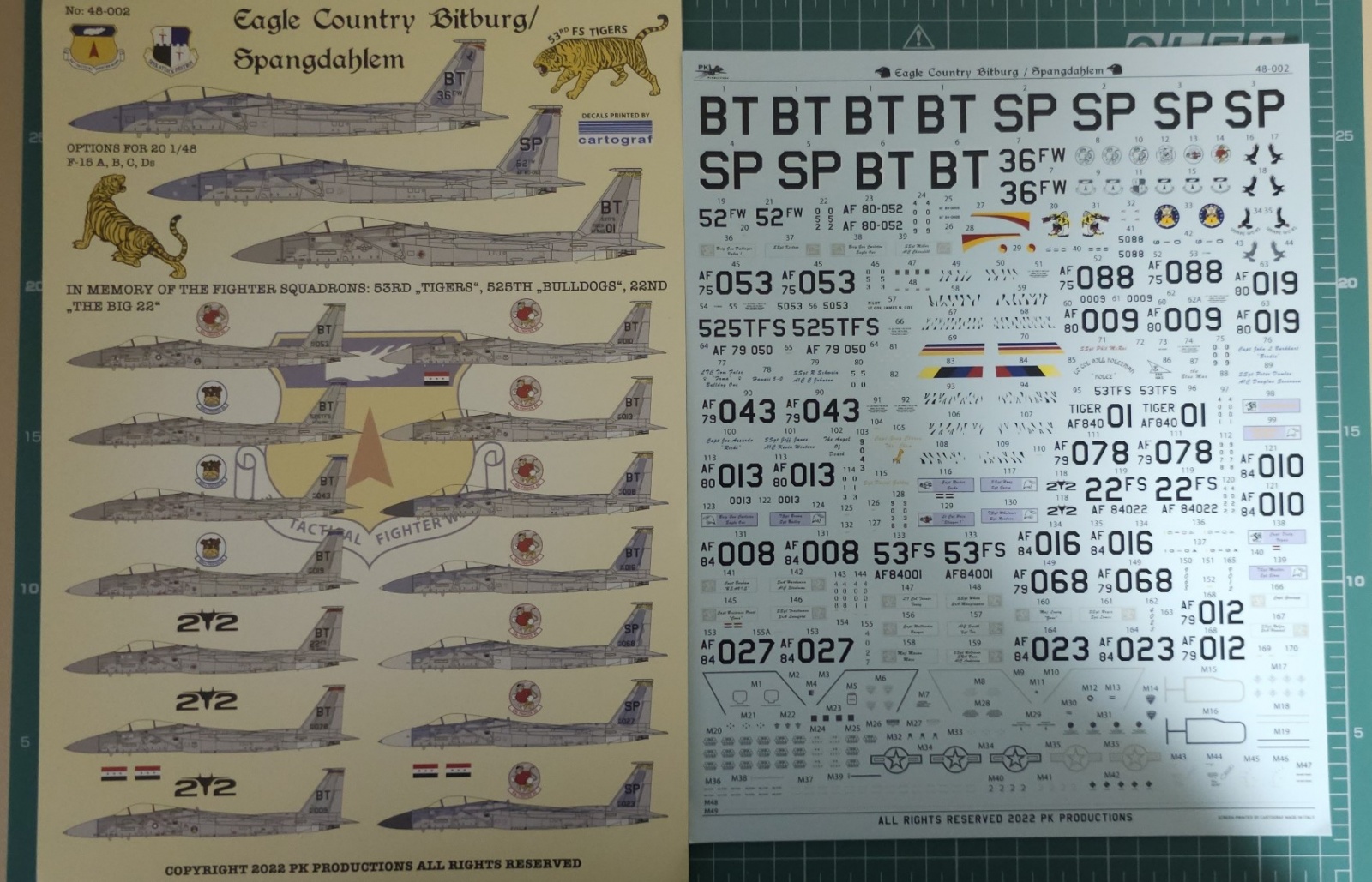PK productions 라는 회사의 1/32 스케일 F-15C 데칼입니다. 지금 구입할 수 있는 MOD Eagle을 재현한 1/32 스케일 데칼 중 유일하지 않을까 생각합니다. 제가 좋아하는 킬마크도 포함되어 있어서 구매했는데 카르토그래프 인쇄가 아닌 점이 좀 아쉬운 데칼입니다.