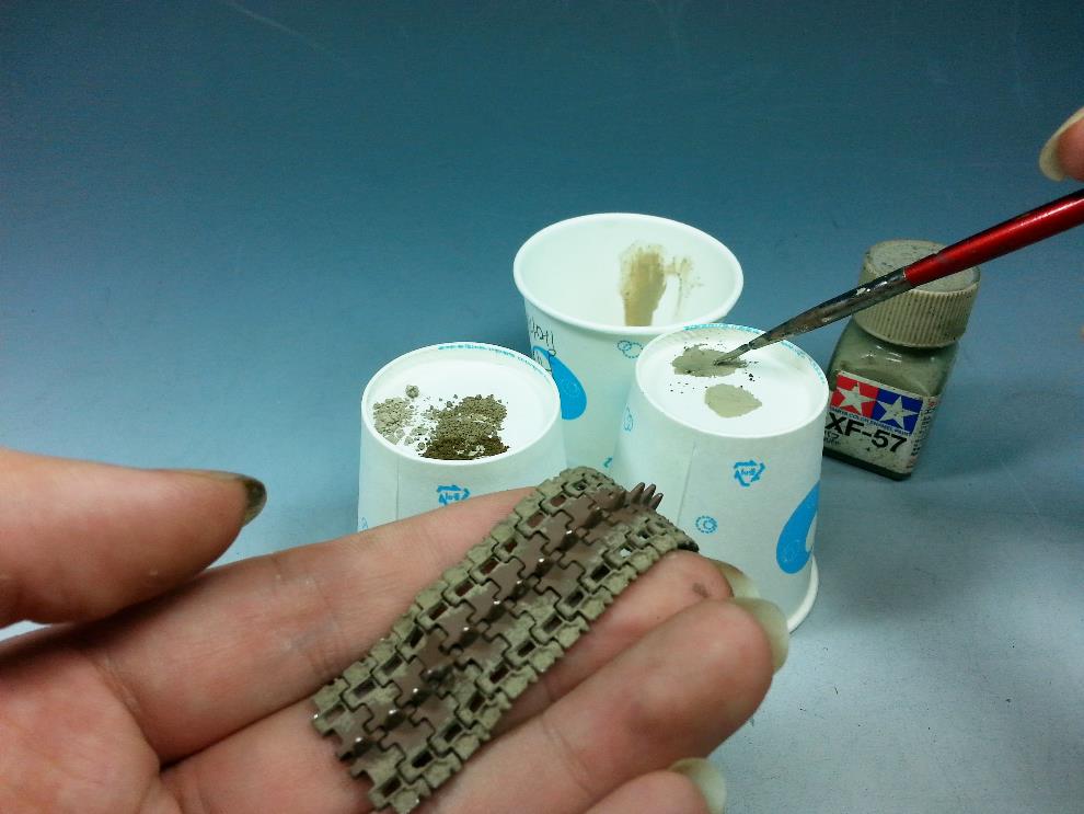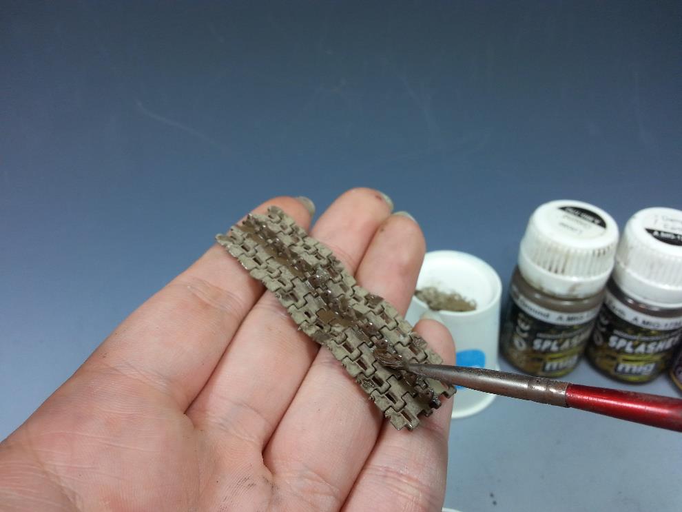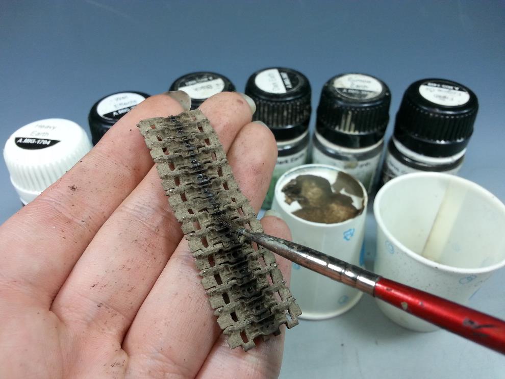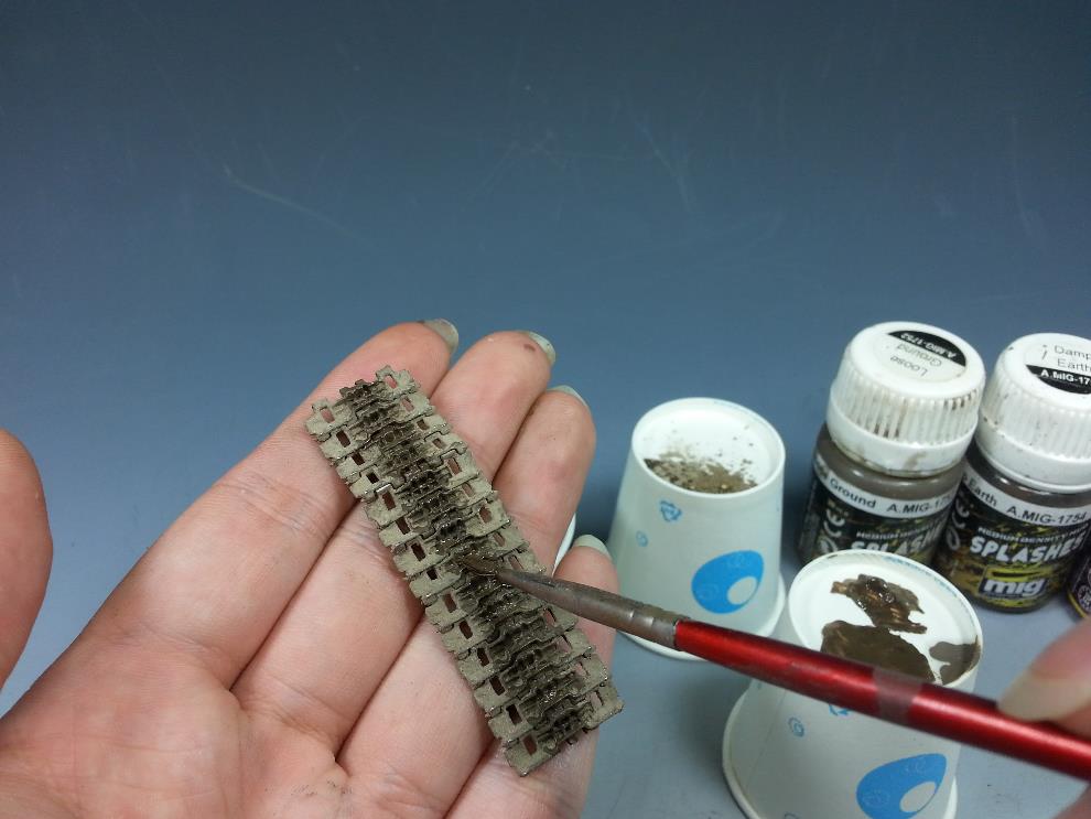 이후 헤비 어스(미그사 헤비 머드 표현제), 이팩트(젖은 표현에 사용하는 미그사 도료, 타미야 X-22클리어로 대체 가능), 블랙 피그먼트, 다크어스, 유럽어스, 프래쉬 엔진 오일(미그사의 엔진오일 표현제)를 섞어 더 어두운 색을 조색합니다.