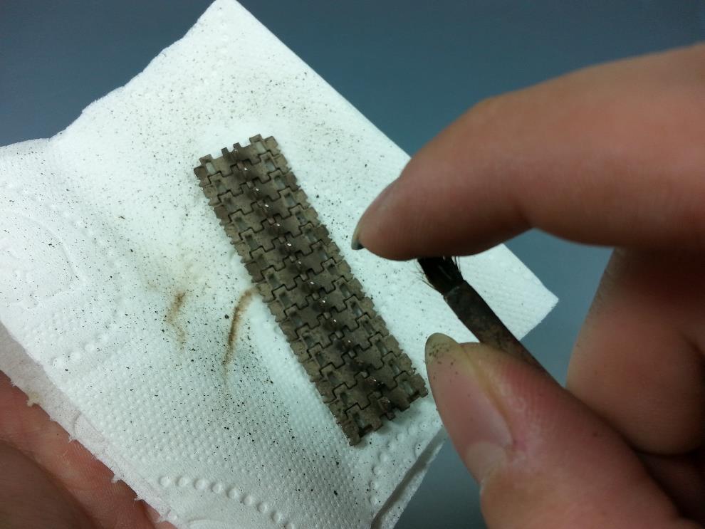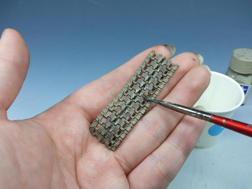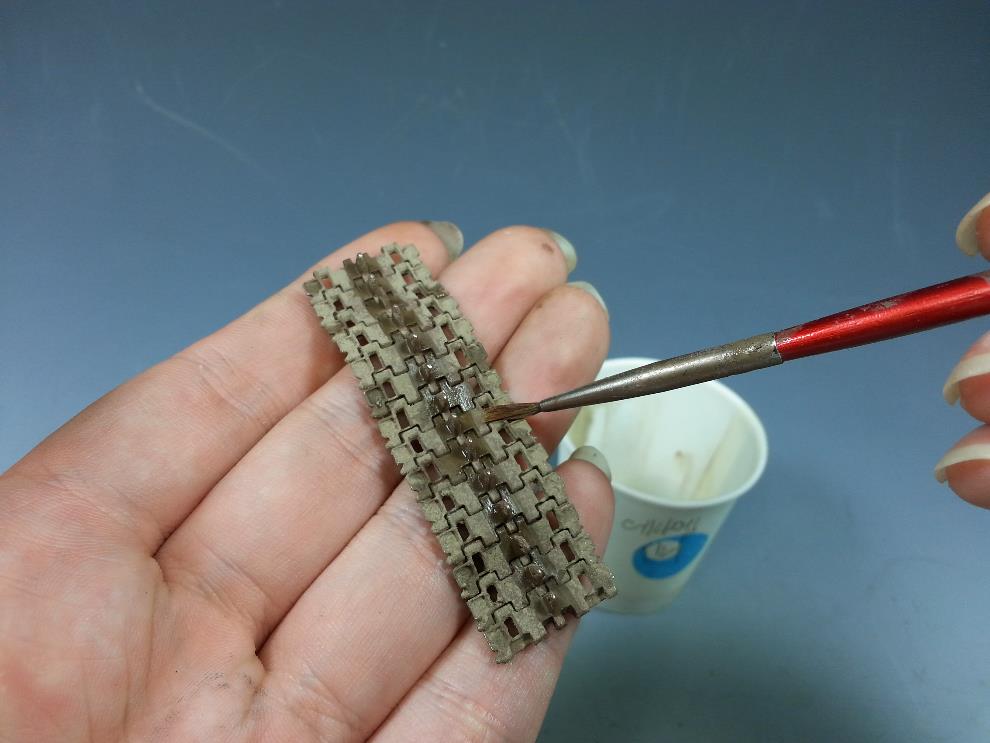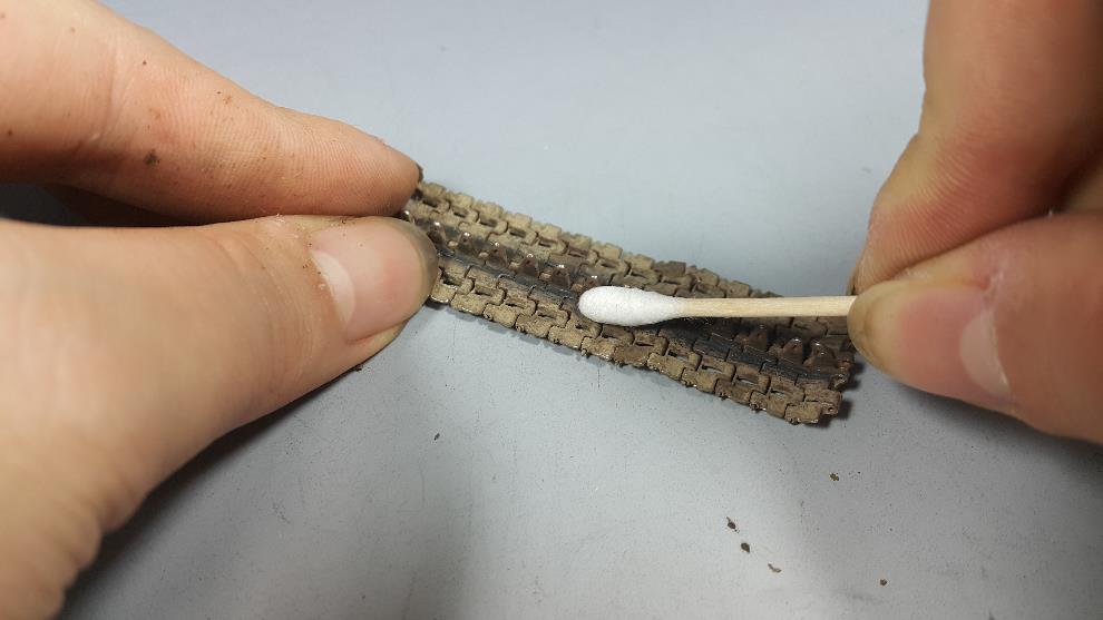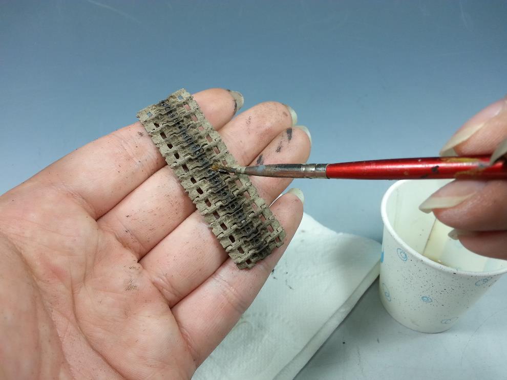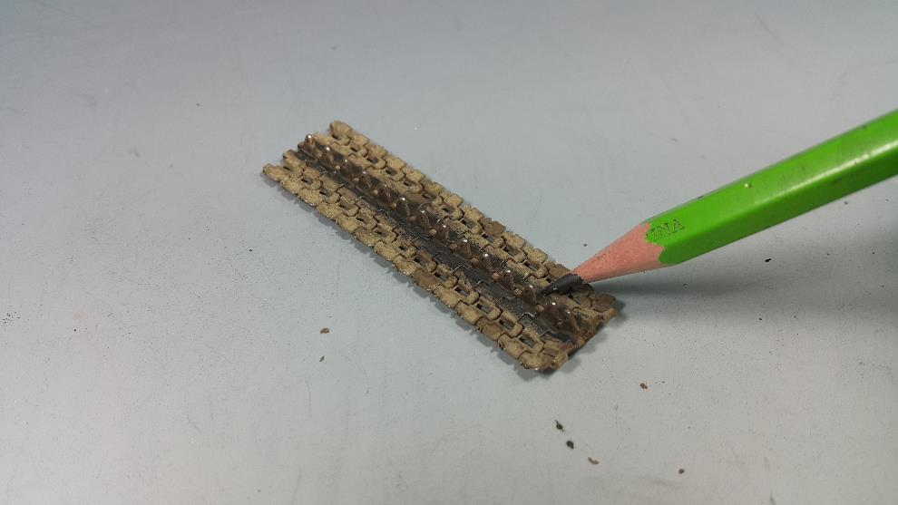 만약 플라스틱이나 고무 궤도라면 같은 방법으로 사포를 이용해 갈아준 후 지면과 가장 많이 닿는 부분(요철부)에 연필이나 은색 에나멜 등을 이용하여 금속 질감을 내주시면 됩니다.