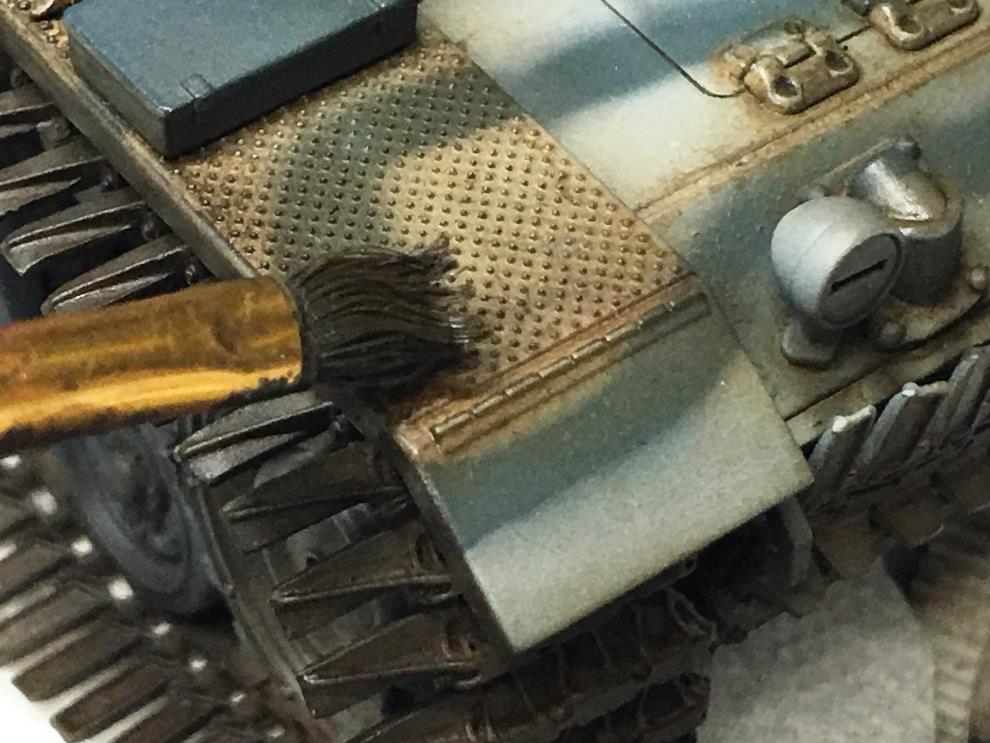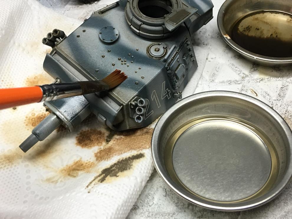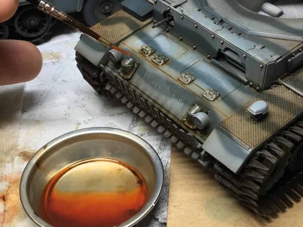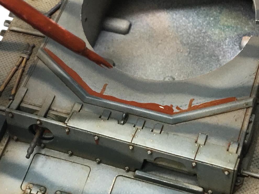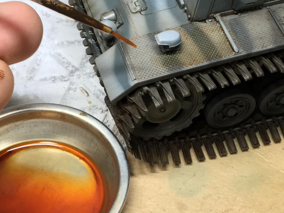 궤도가 건조되는 동안 유화물감 로우엄버를 중간정도로 희석하여 핀워싱을 해줍니다 세세한 디테일을 살려주는 중요한 작업입니다