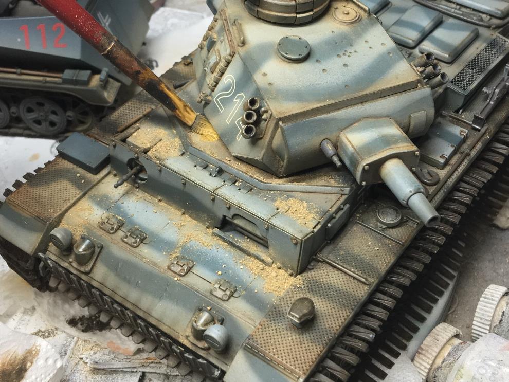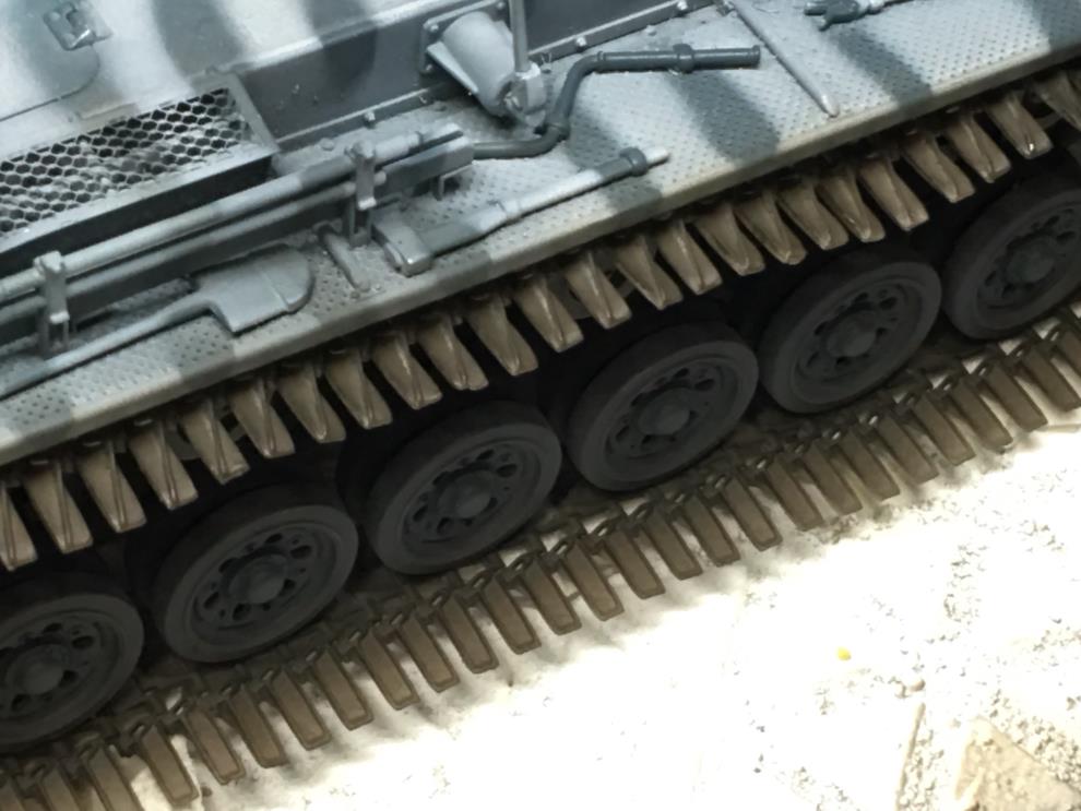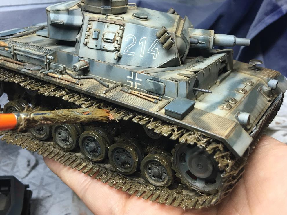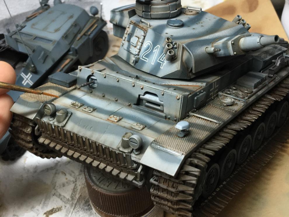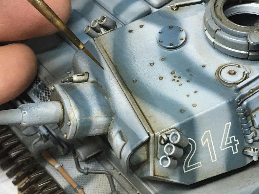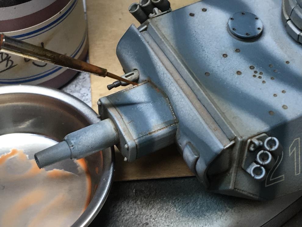 궤도가 건조되는 동안 유화물감 로우엄버를 중간정도로 희석하여 핀워싱을 해줍니다 세세한 디테일을 살려주는 중요한 작업입니다