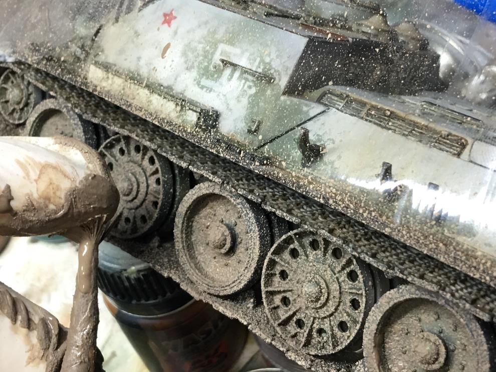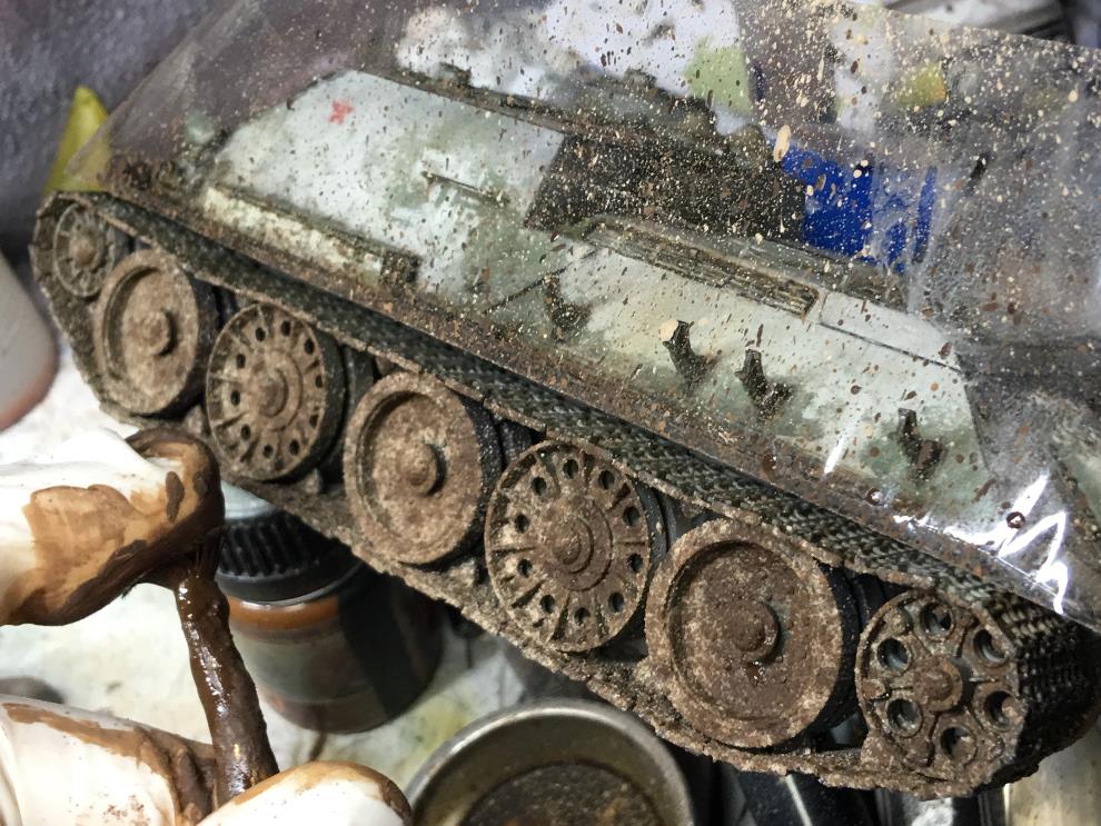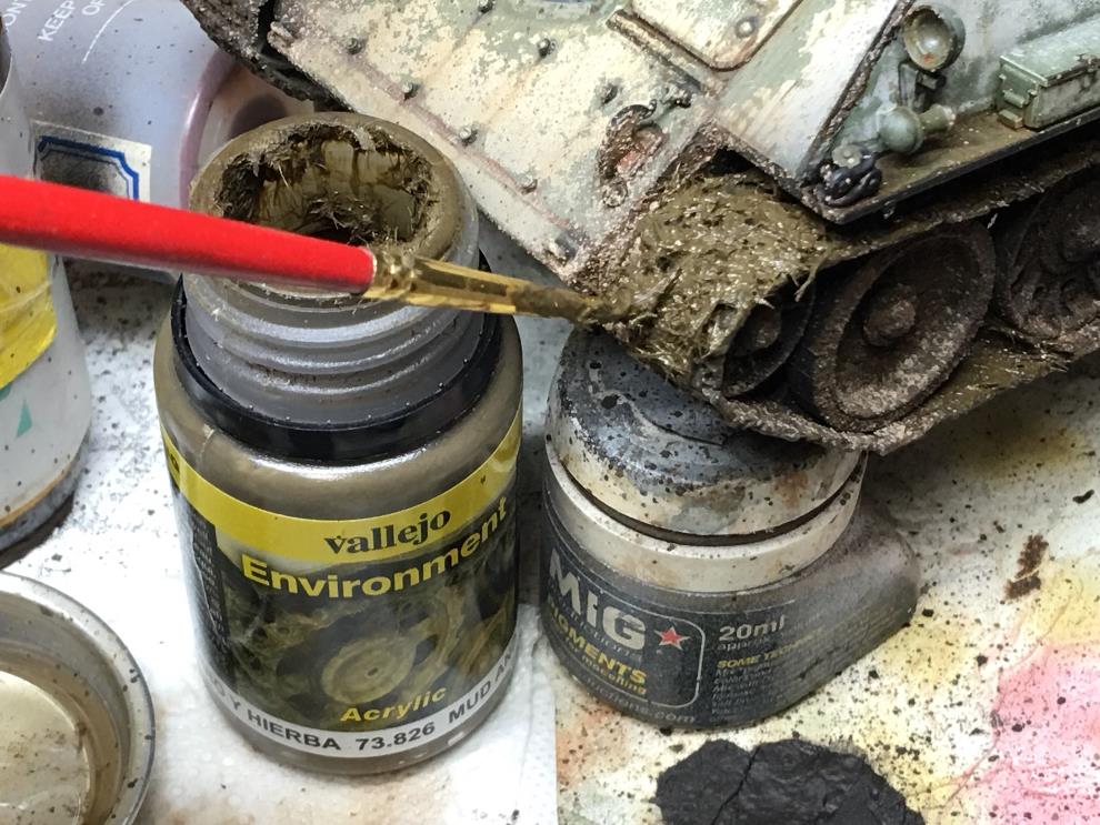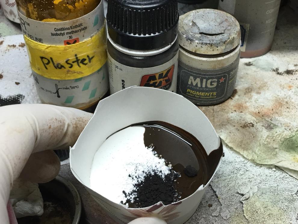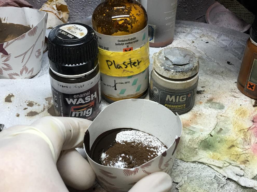 처음에는 색을 좀 밝게 플라스터와 다크머드 에나멜, 먼지표현제 에나멜을 섞어 아래사진과 같이 붓으로 튀겨줍니다