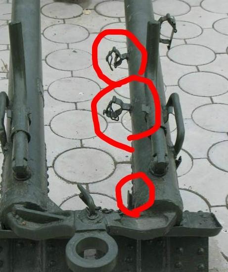 1번은, 포를 견인이나 이동을 하기 위해 접을 때, 양쪽 이빨끼리 고정시켜 물어주는 부품입니다